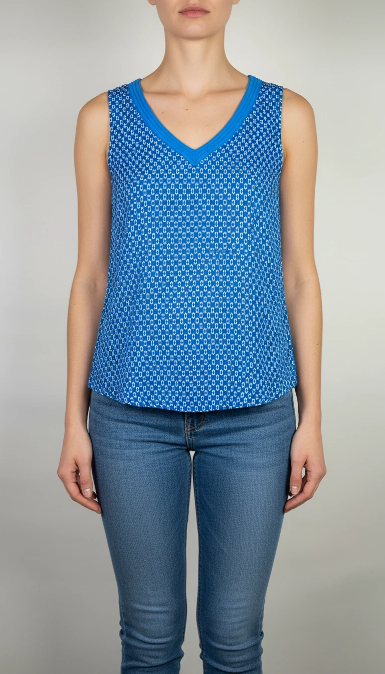 تاپ زنانه استوک کد ۱۳۱۳ | تاپ بدونآستین آبی خنک و ریزشدار مناسب سایز ۳۸–۴۰ | زرماه گالری