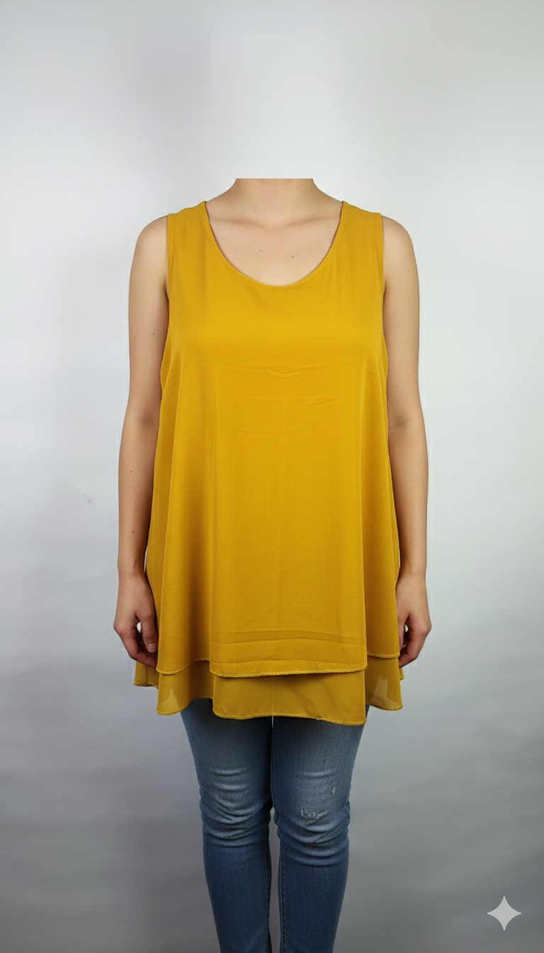 تاپ زنانه وارداتی استوک کد ۱۱۸ مناسب سایز ۴۸-۵۰ | مدل دو لایه حریر رنگ خردلی خنک و مجلسی