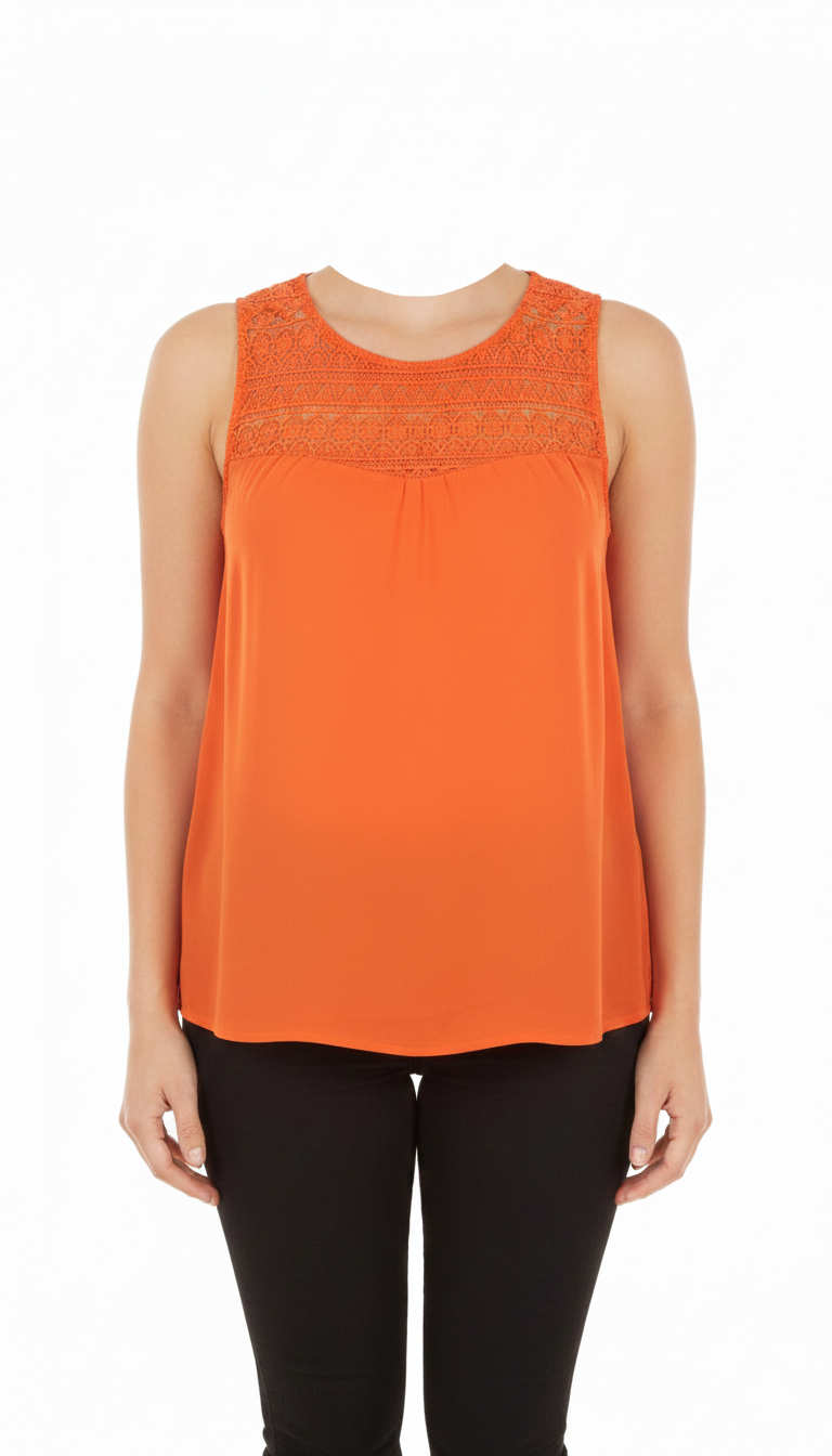 تاپ زنانه وارداتی استوک کد ۲۰۳۲ مناسب سایز ۴۸ و ۵۰ | رنگ نارنجی مجلسی با یقه گیپور