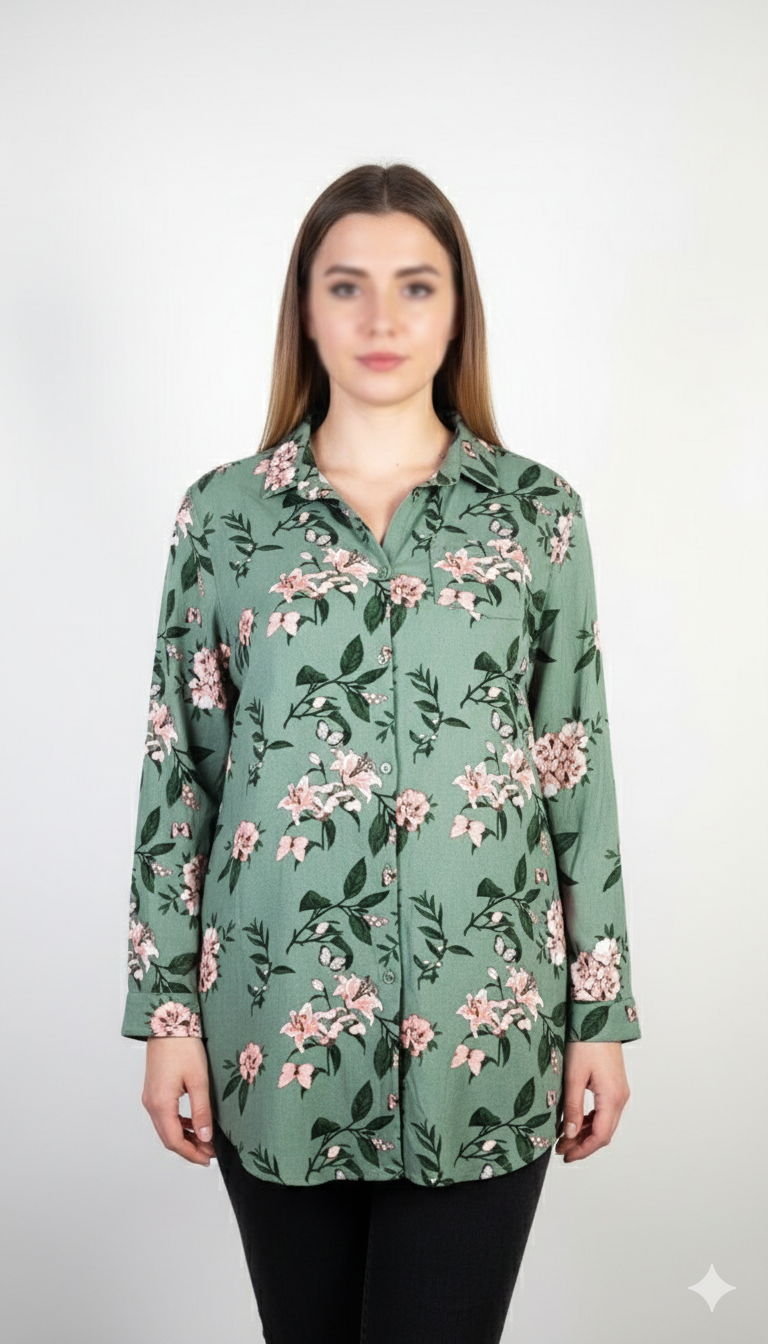 شومیز زنانه وارداتی استوک کد ۱۸۹۸ مناسب سایز ۳۸-۴۰ | طرح گلدار بهاری با رنگ سبز ملایم