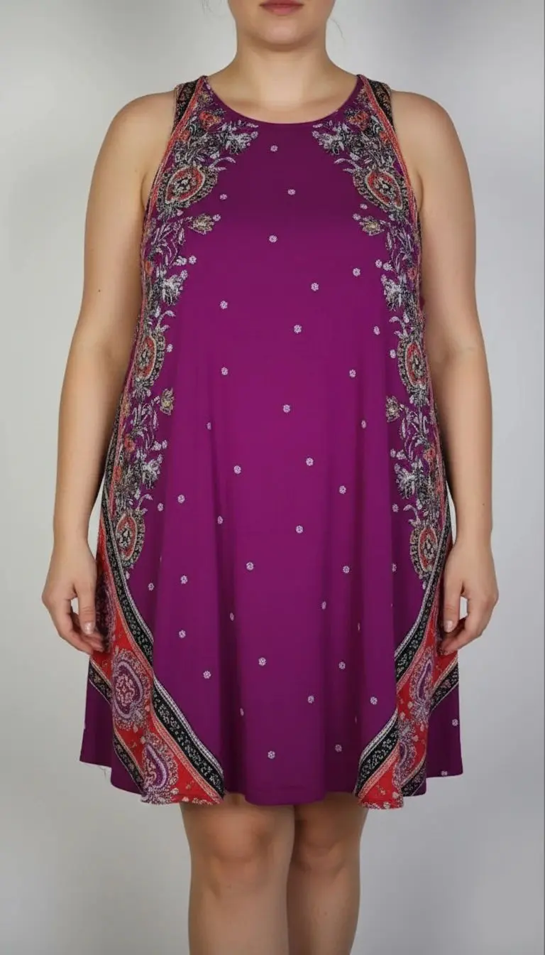 تاپ زنانه سایز بزرگ استوک کد ۱۳۴۴ | تونیک بدونآستین بنفش طرحدار آزاد و خنک سایز ۴۴–۴۶ | زرماه گالری