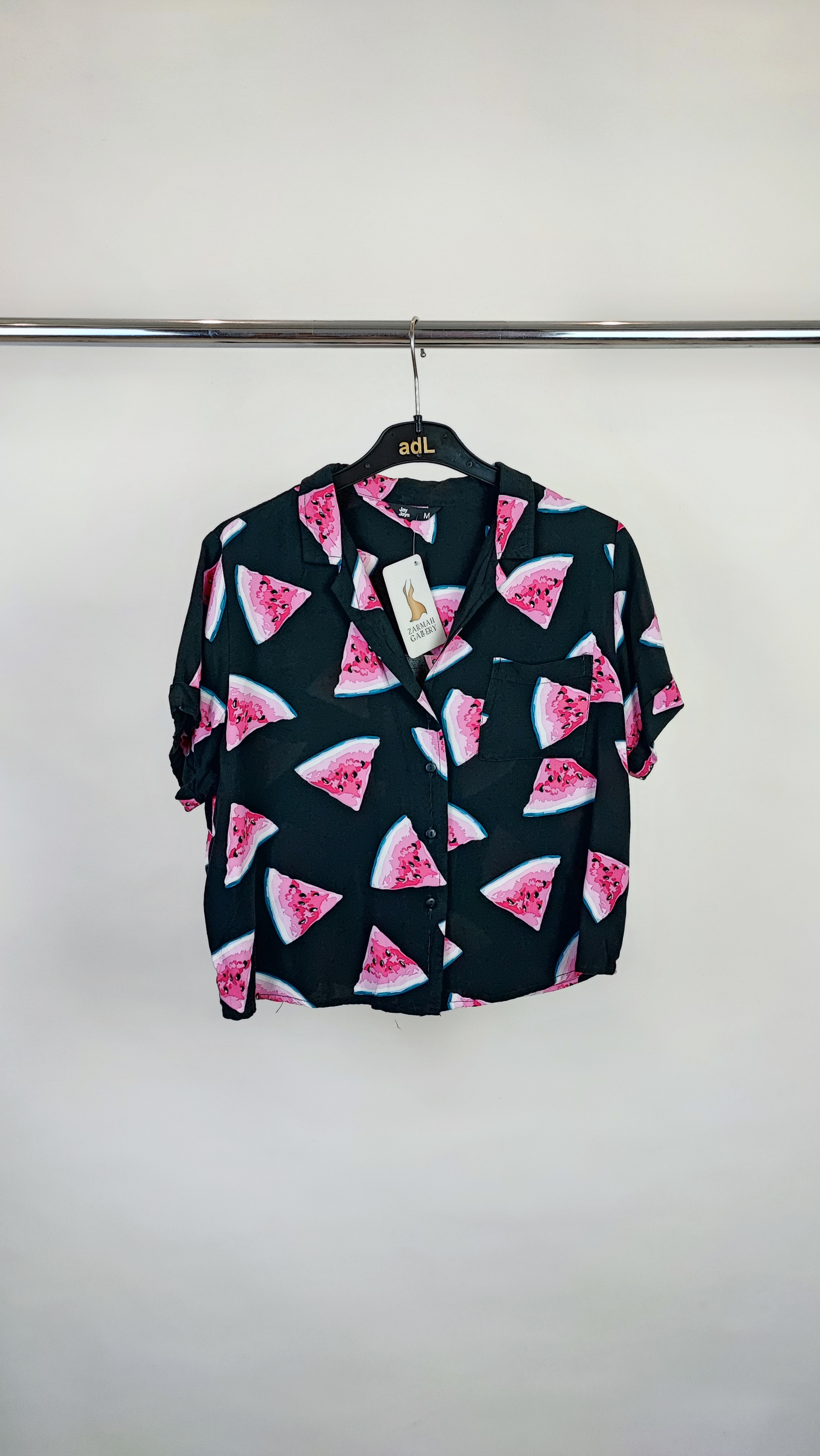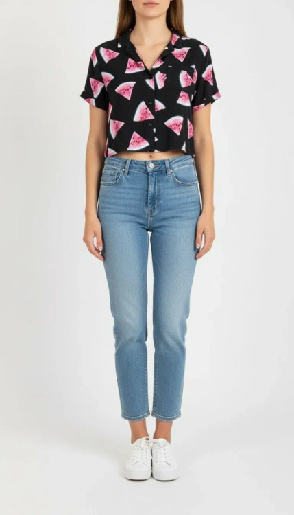 شومیز نیمتنه زنانه کد ۶۰۵ از مجموعه خاص زرماه گالری، انتخابی جذاب برای استایل تابستانی و روزمره است. پارچه سبک و خنک با طرح صورتی روی زمینه مشکی، ظاهری لطیف و چشمنواز ایجاد کرده. مدل جلوساده و قد کوتاه آن برای ست شدن با شلوار جین یا دامن فوقالعاده است.
