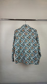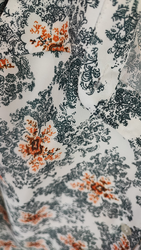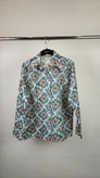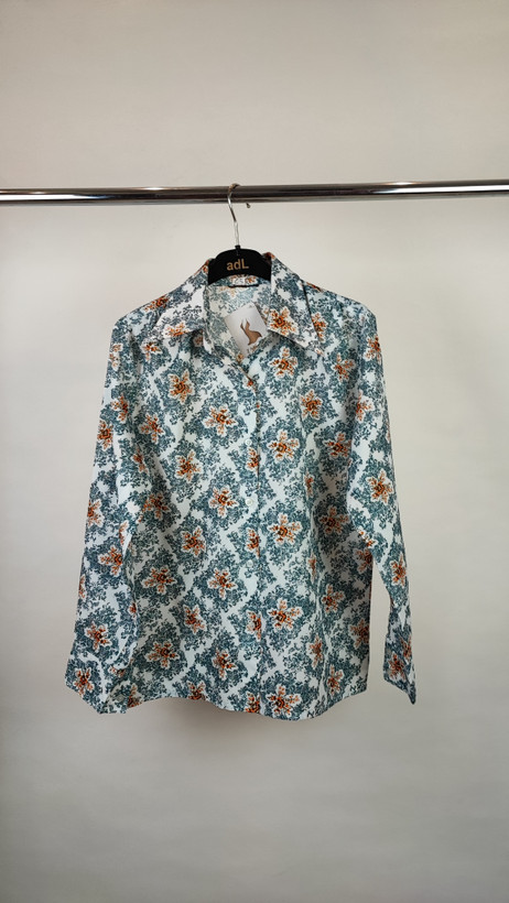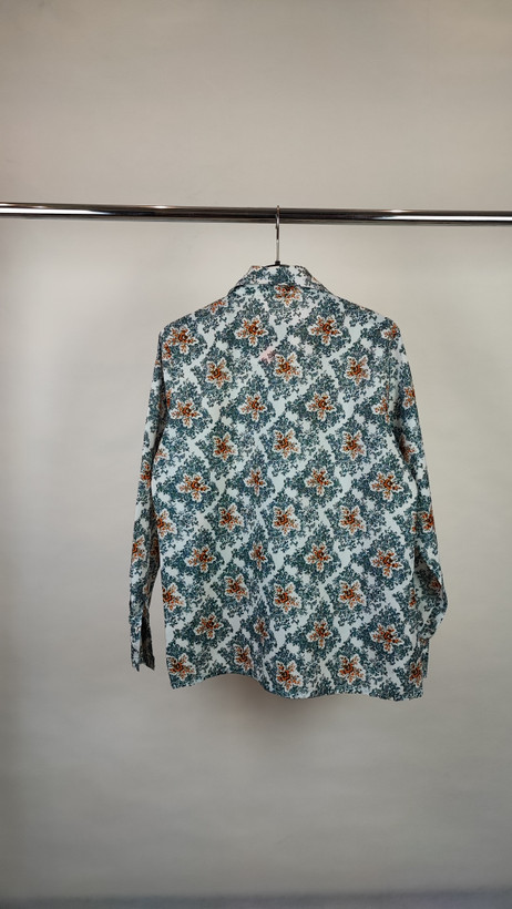 شومیز زنانه استوک کد ۷۷۴(ایراد دار.^یکی از سر آستیناش یکم در رفتگی دوخت داره) | طرح گلدار سبزآبی با یقه کلاسیک سایز ۴۴–۴۶ | زرماه گالری 🌿💎