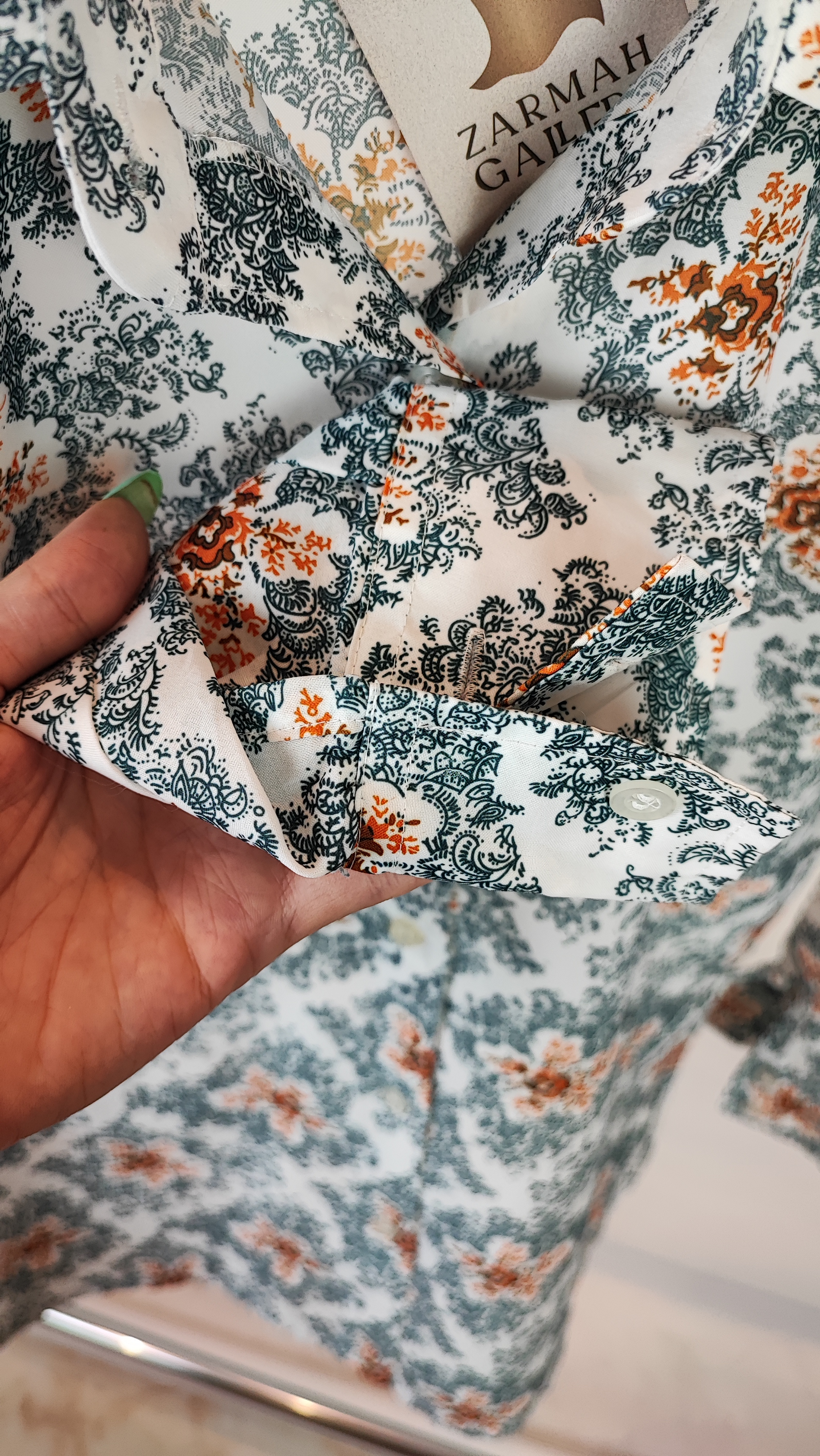 شومیز زنانه استوک کد ۷۷۴(ایراد دار.^یکی از سر آستیناش یکم در رفتگی دوخت داره) | طرح گلدار سبزآبی با یقه کلاسیک سایز ۴۴–۴۶ | زرماه گالری 🌿💎