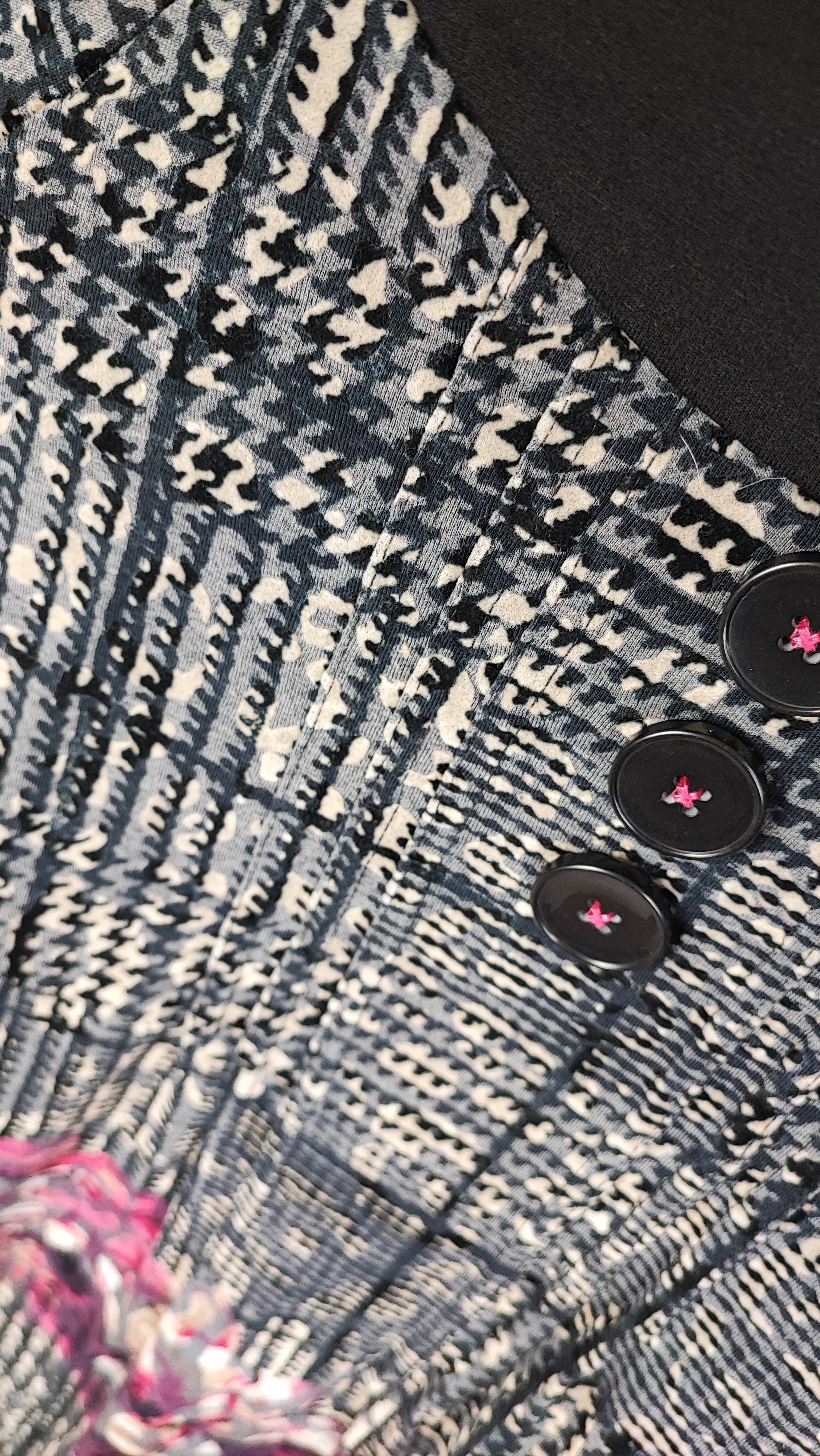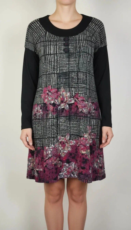 ترکیب طرحهای هندسی و فانتزی بنفش در قسمت پایین پیراهن، استایل خیلی چشمگیر و متفاوتی میسازه. آستین بلند مشکی، یقهگرد ساده و تنخور راحتش باعث میشه برای استفاده روزمره، دورهمی یا زیر مانتو فوقالعاده کاربردی باشه ✨