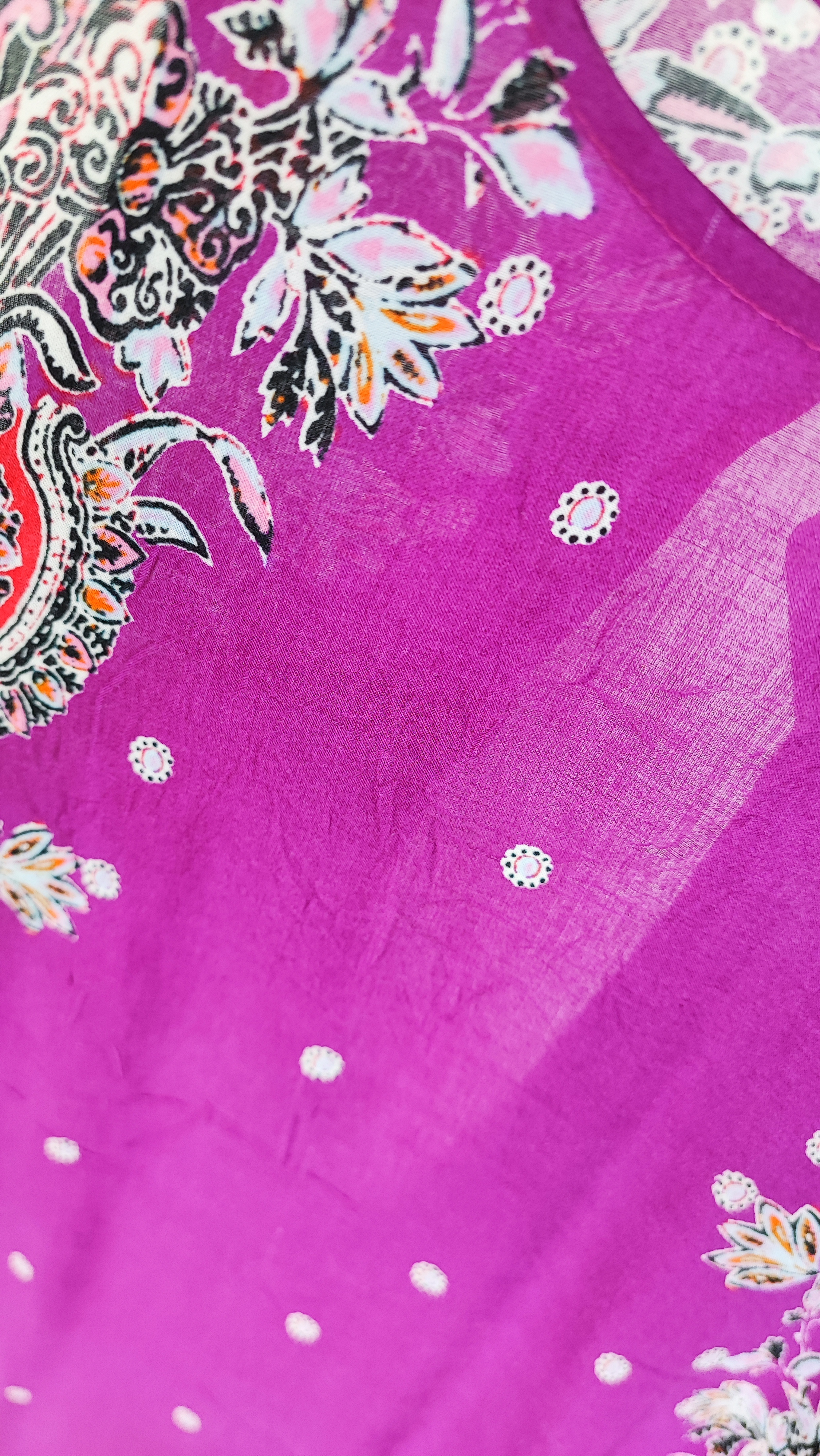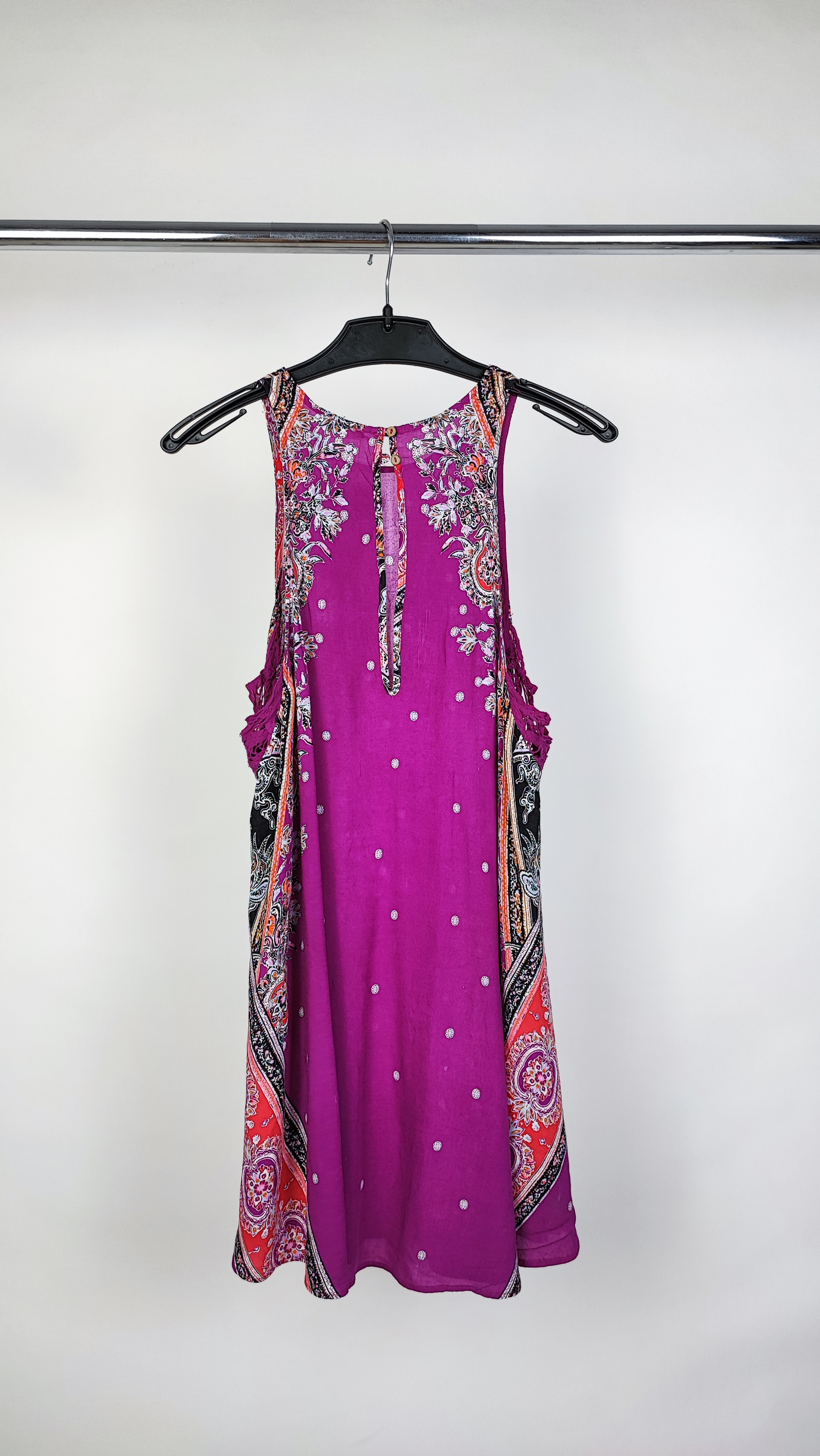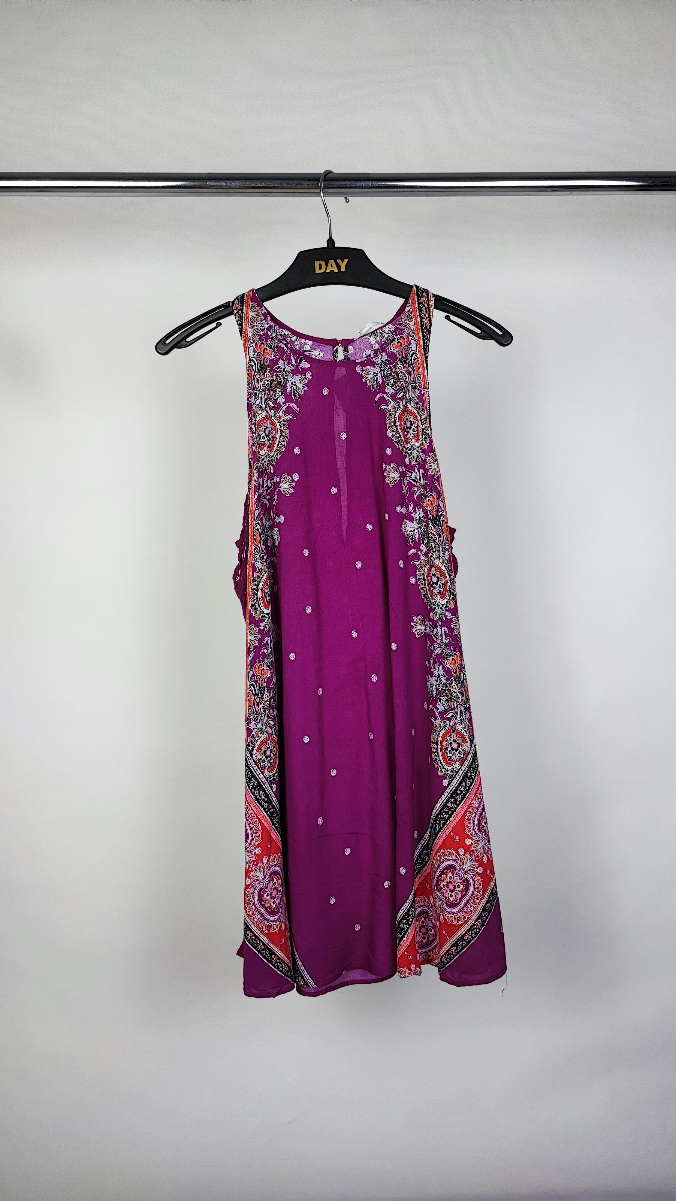 تاپ زنانه سایز بزرگ استوک کد ۱۳۴۴ | تونیک بدونآستین بنفش طرحدار آزاد و خنک سایز ۴۴–۴۶ | زرماه گالری