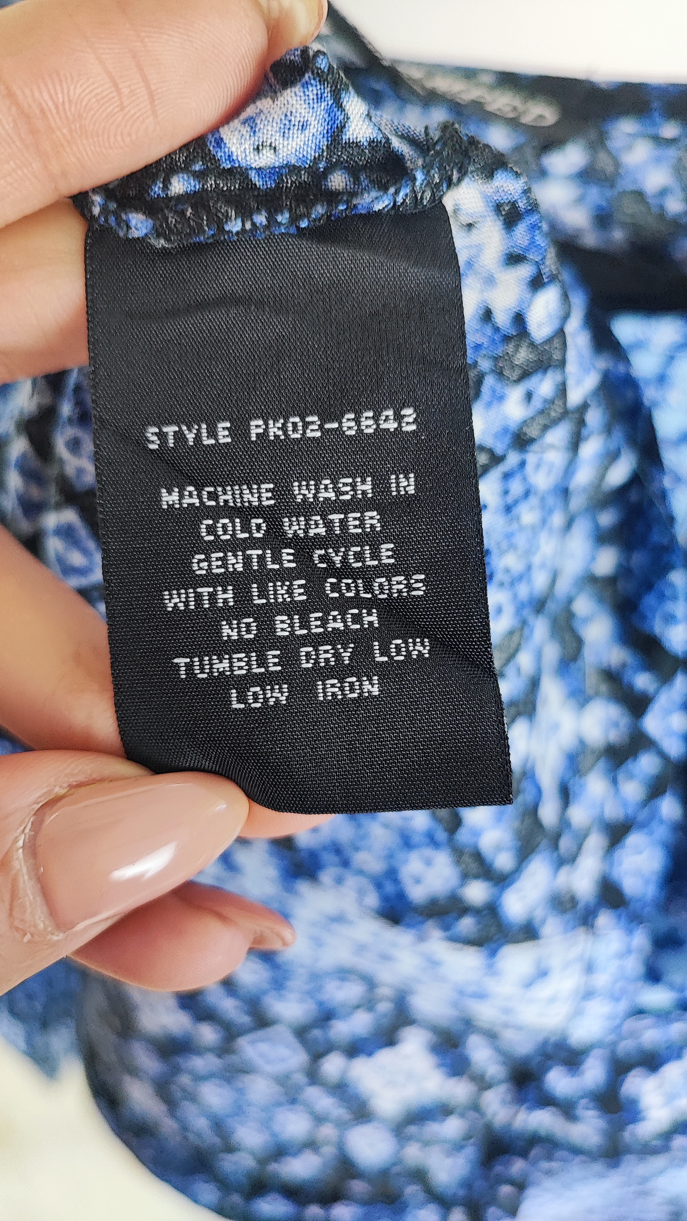 شومیز نیمتنه زنانه استوک کد ۱۴۱۵ | نیمتنه آبی طرحدار سبک و خنک مناسب سایز ۴۰–۴۲ | زرماه گالری