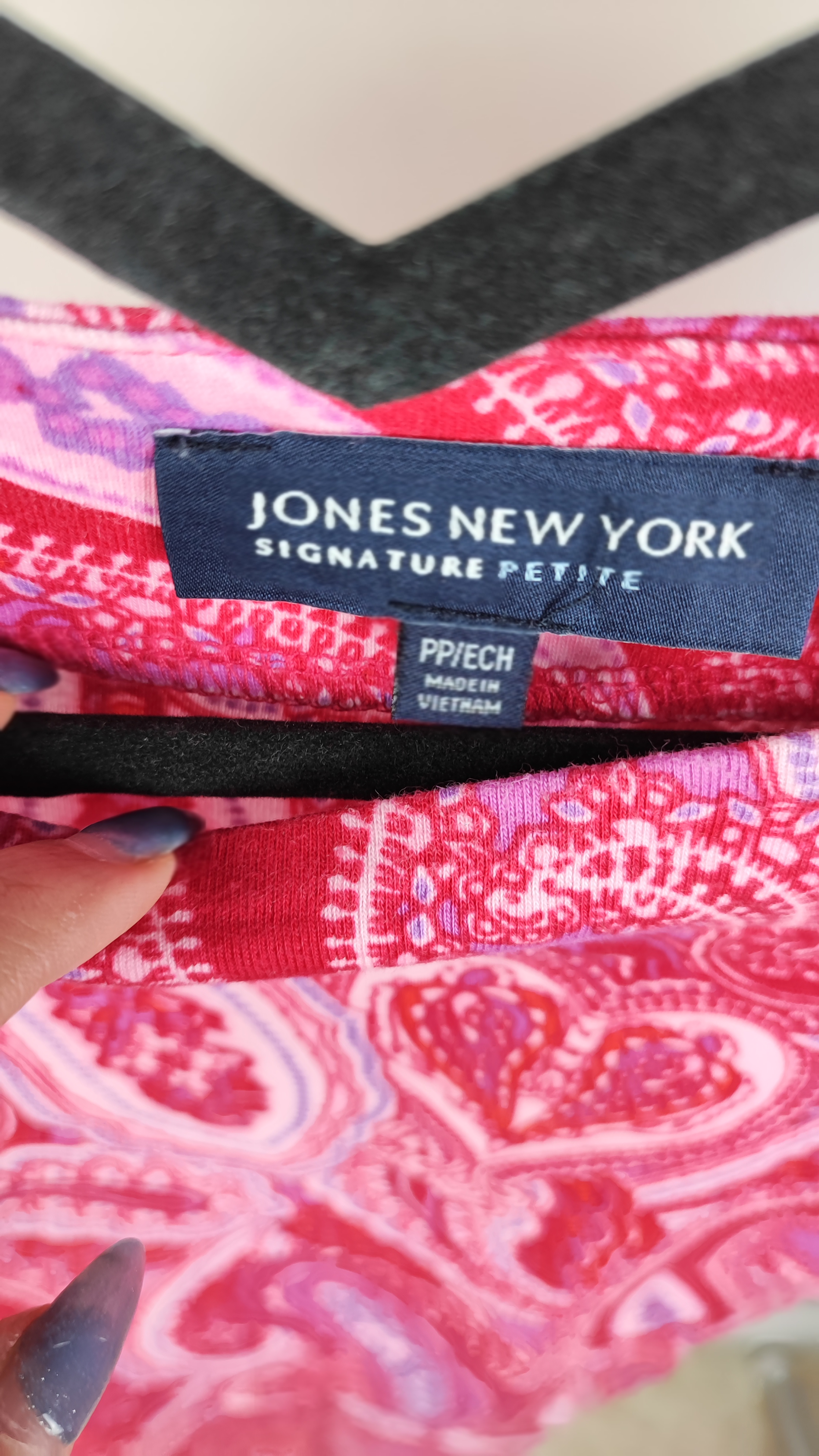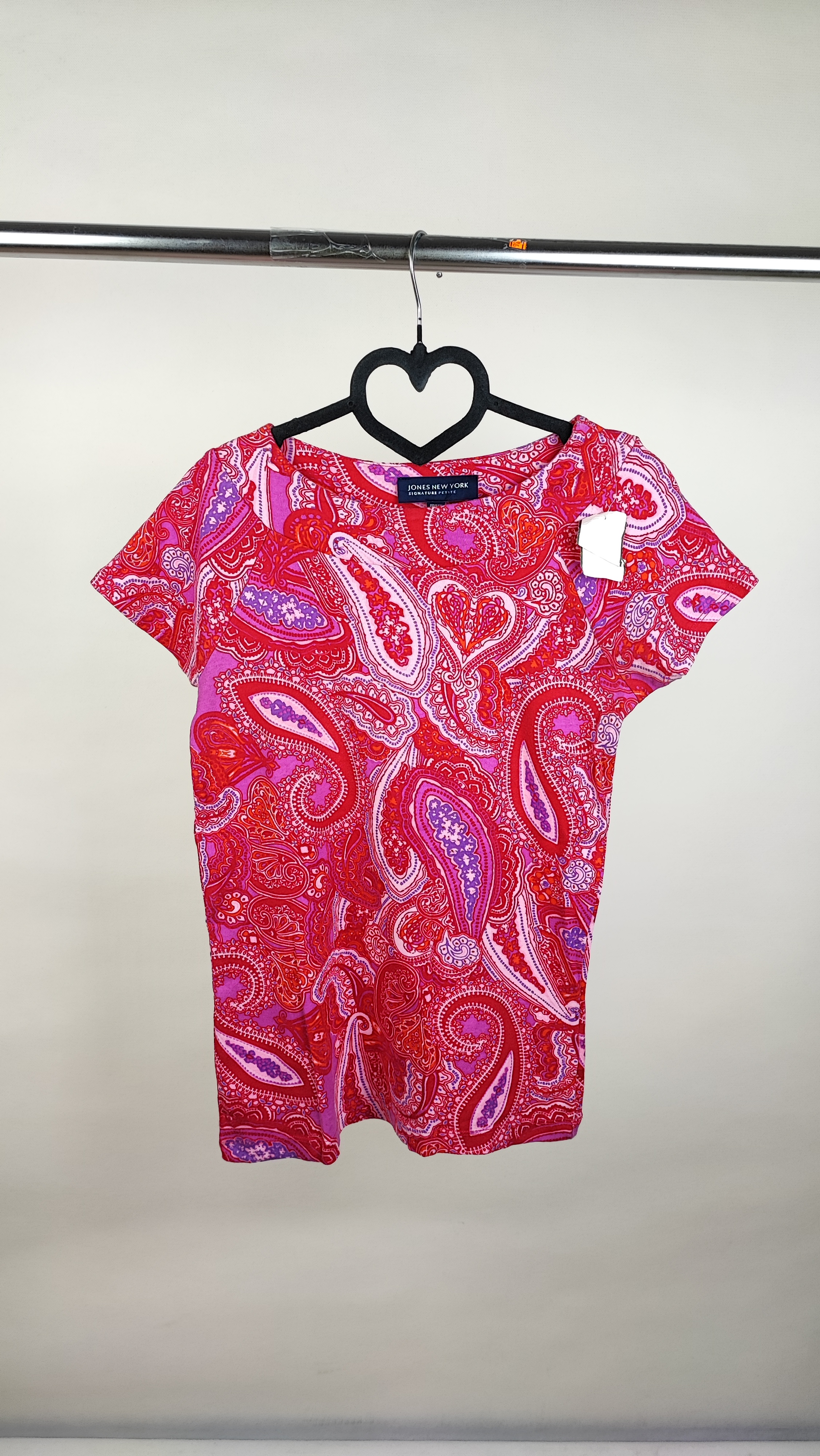 تیشرتی خاص و خوشرنگ برای خانمهای شیکپوش که به دنبال اصالت و راحتی هستند. این تیشرت زنانه آستین کوتاه از برند معتبر آمریکایی Jones New York و از سری Signature Petite است. طراحی یقه هفت و پارچهای با طرح سنتی بتهجقه (Paisley) در تناژهای جذاب قرمز، صورتی و بنفش، ظاهری زنده و شاداب به استایل شما میبخشد.