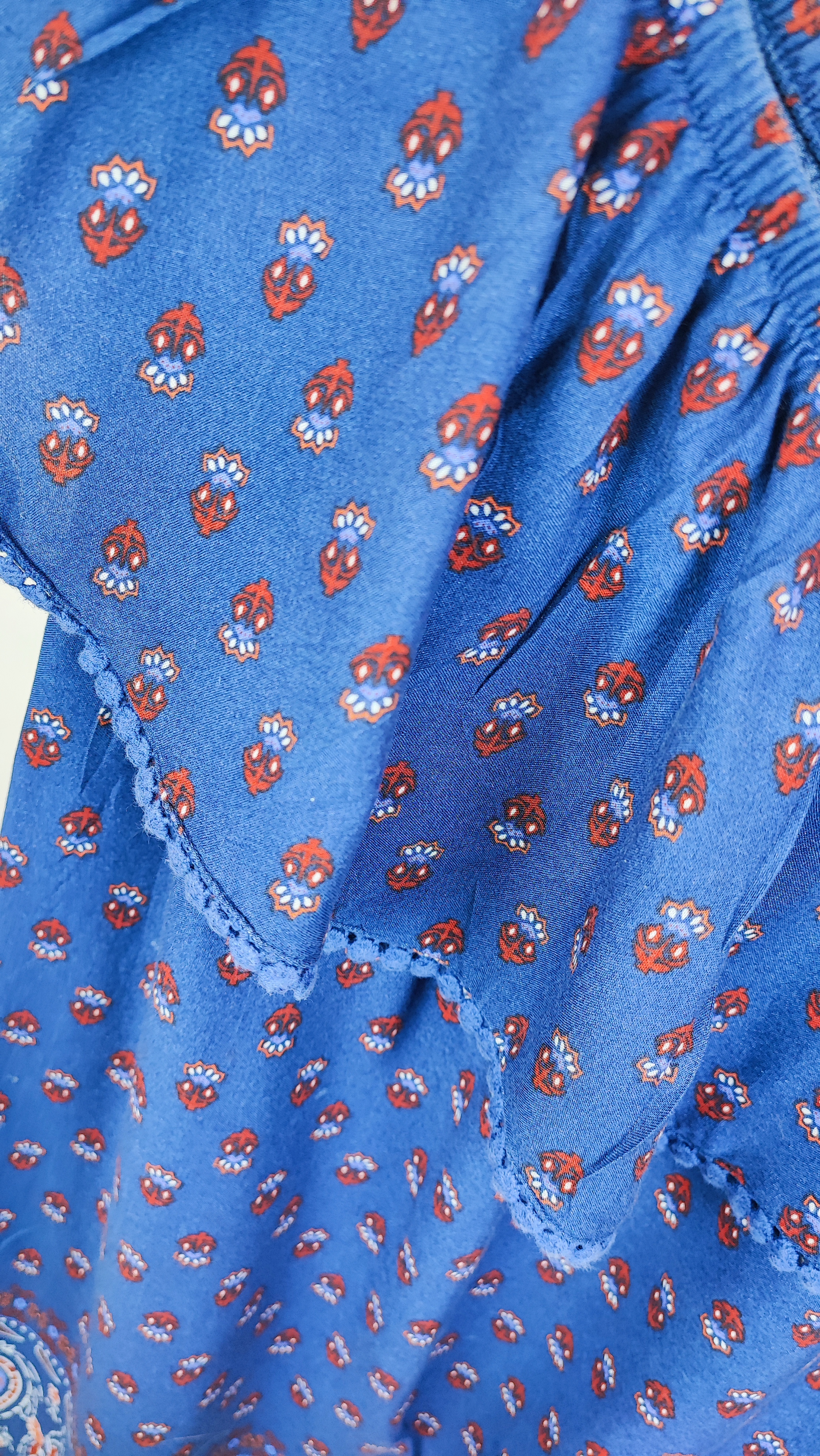 پارچه این کار ۱۰۰٪ از جنس ریون (Rayon) درجه یک است که به لطافت، خنکی و ریزش زیبای روی تن شناخته میشود؛ بنابراین بهترین انتخاب برای روزهای گرم سال میباشد. طرح زیبای بتهجقه آبی (Blue Sapphire Print) به همراه مدل یقه چیندار و آزاد، به شما استایلی جذاب و اعتمادبهنفس بالایی میبخشد. با خرید این شومیز، شما صاحب یک برند اورجینال با قیمتی استثنایی و باورنکردنی میشوید.