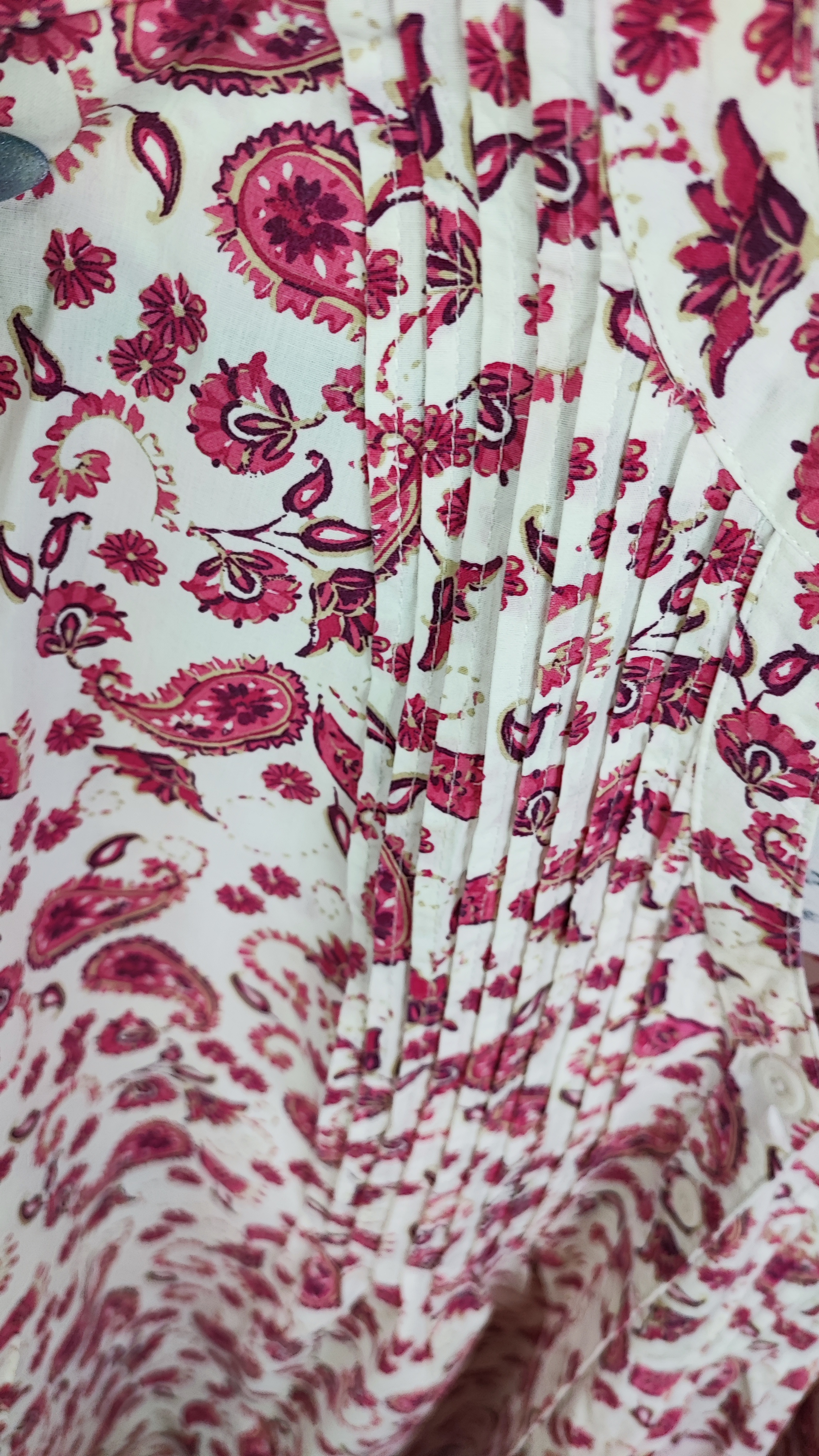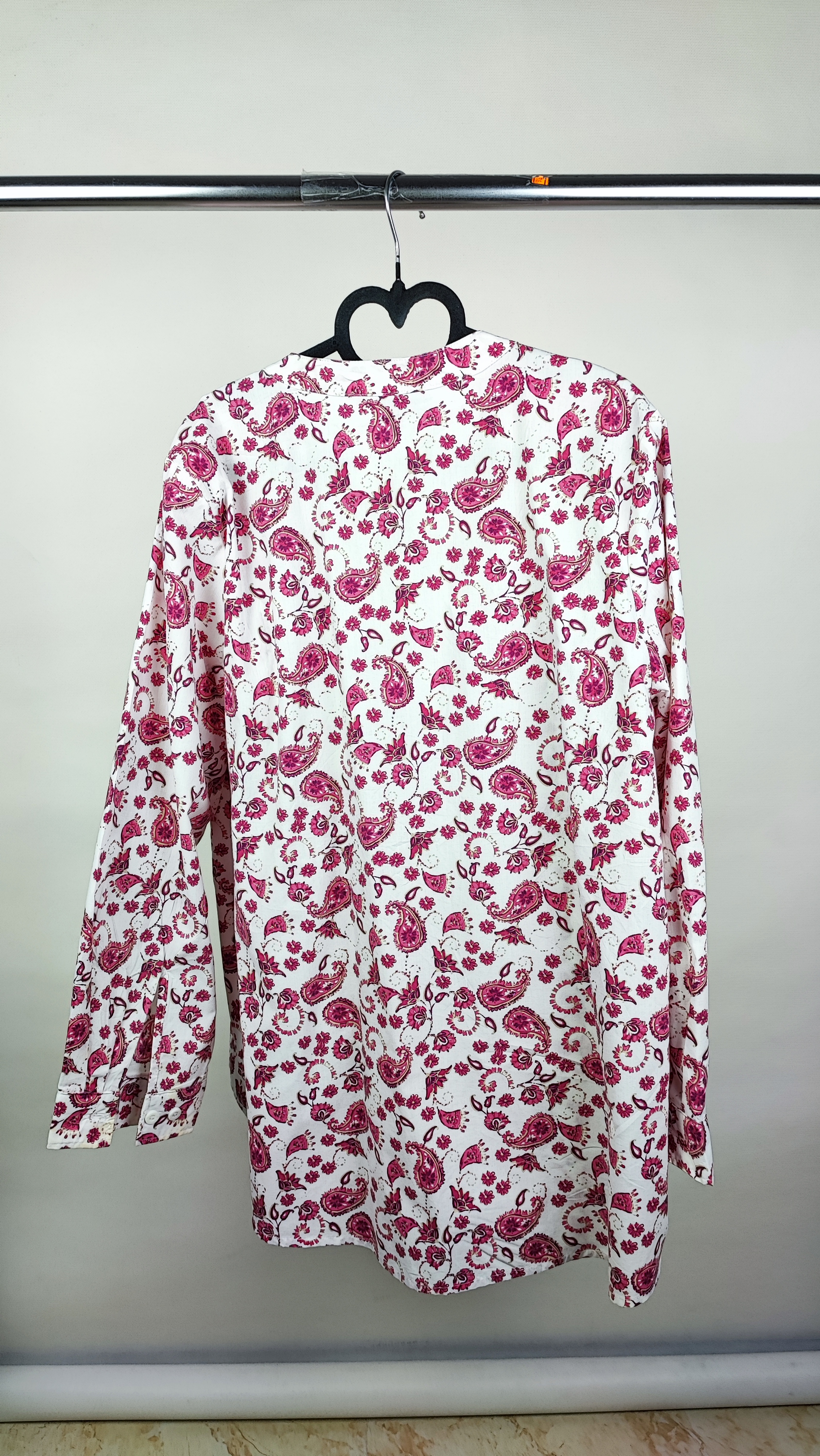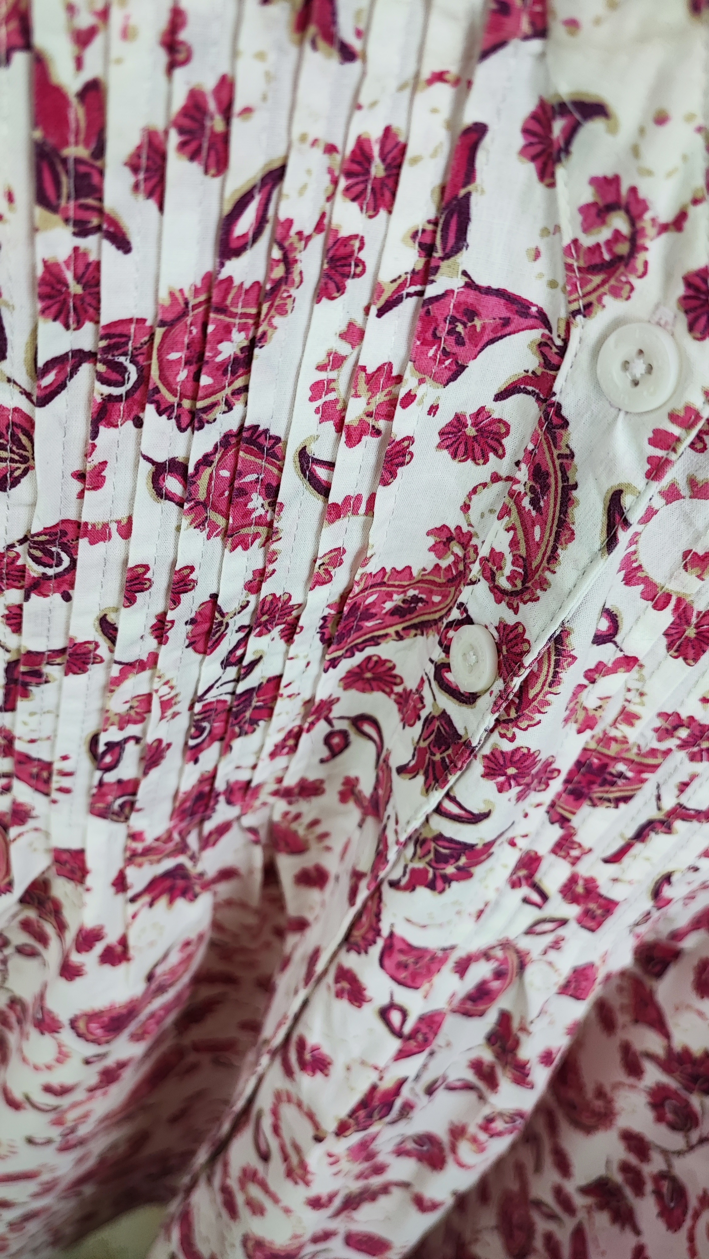 ترکیب پارچه این کار ۵۵٪ پنبه (نخی) و ۴۵٪ پلیاستر است که علاوه بر خنکی و تنفسپذیری فوقالعاده، دوام بالایی دارد و به راحتی چروک نمیشود. طرح زیبای بتهجقه (Paisley) صورتی روی زمینه سفید، به همراه جزئیات ظریف پیلی در جلو و دکمههای سرآستین، ظاهری جذاب و خانمانه به این شومیز بخشیده است. قواره آزاد و یقه هفت این کار، راحتی کامل را برای خانمهای سایزبزرگ فراهم میکند. با قیمتی استثنایی (کمتر از قیمت کارهای تولید داخل)، صاحب یک کار برند اورجینال شوید.