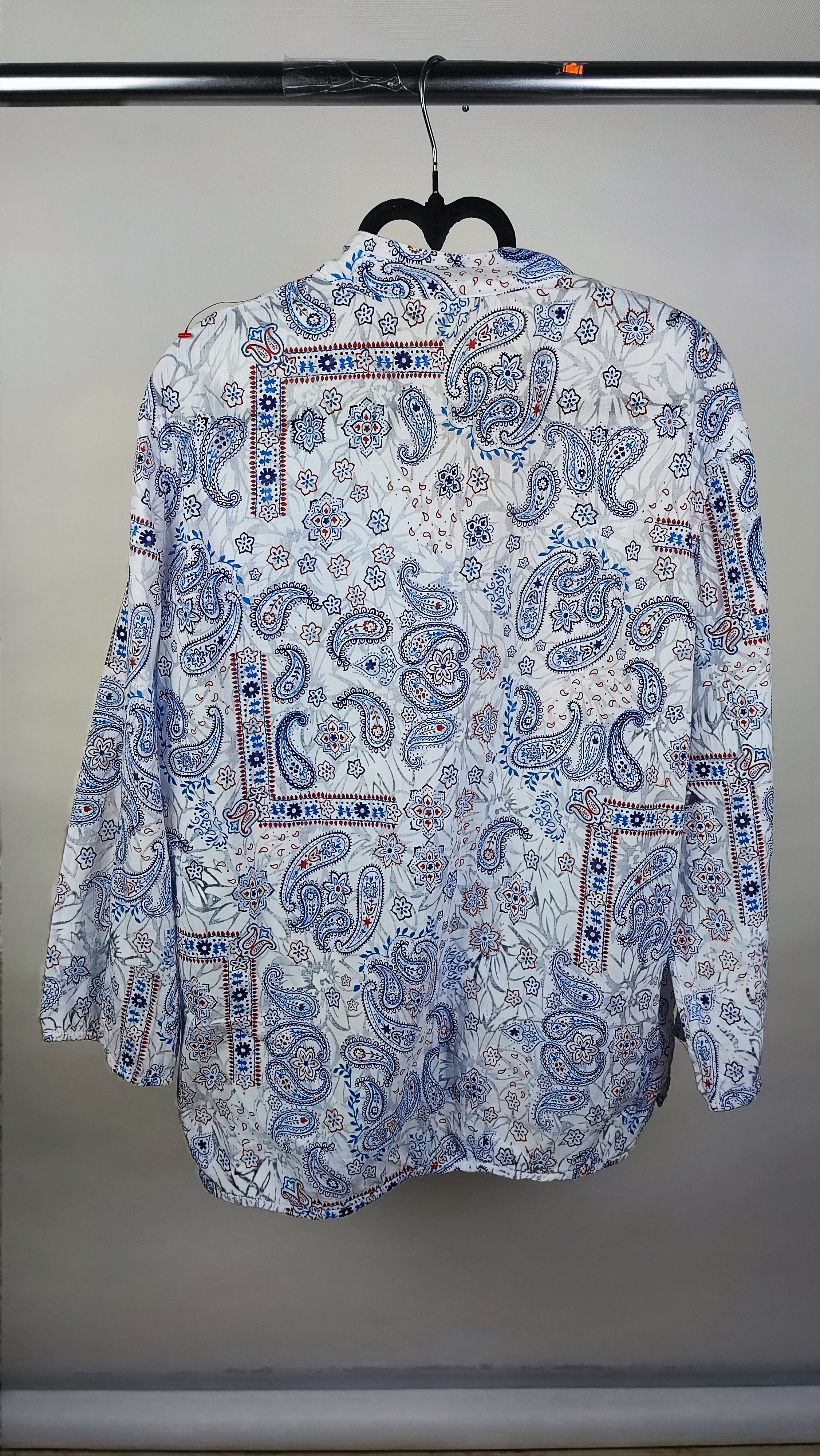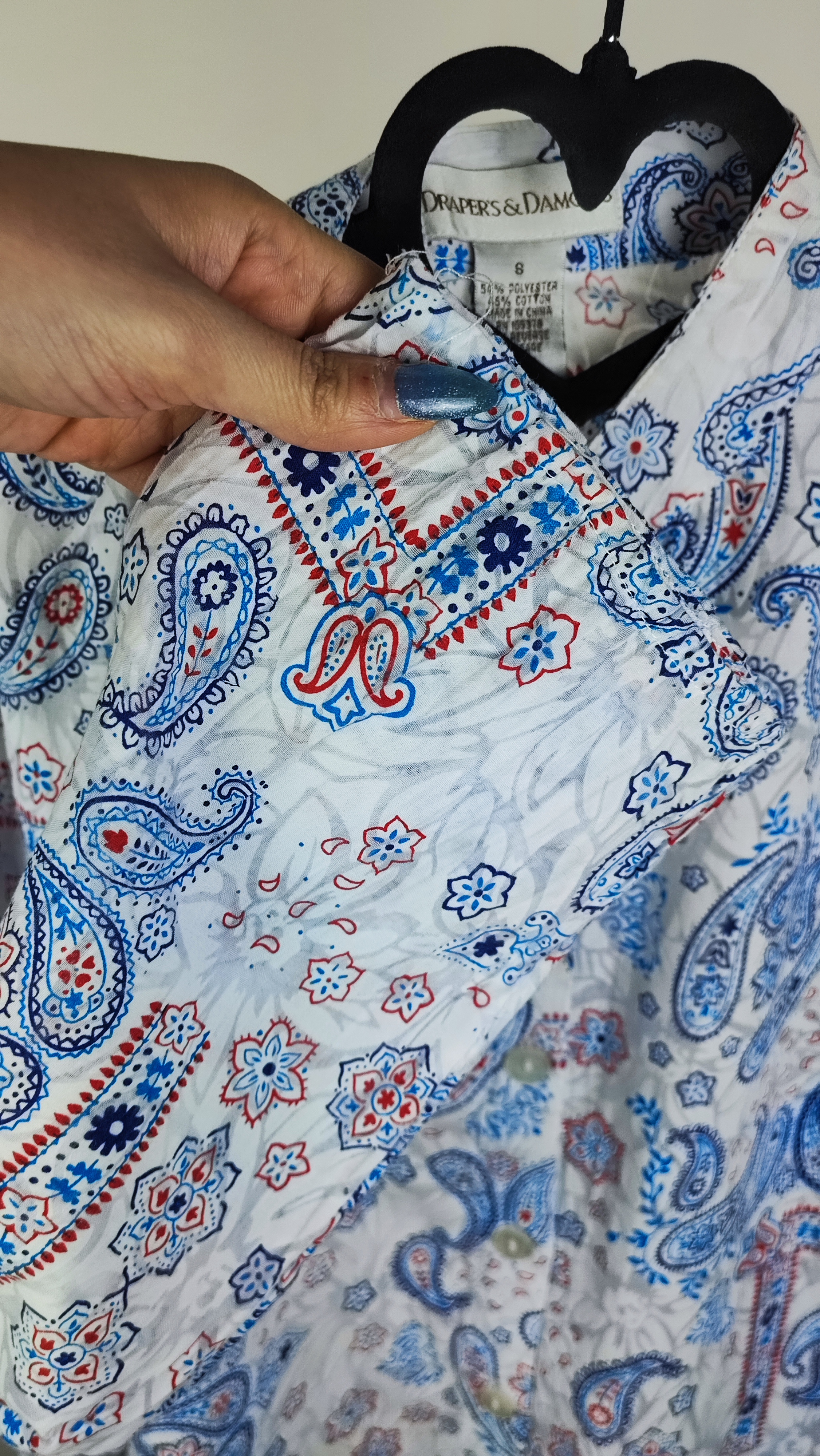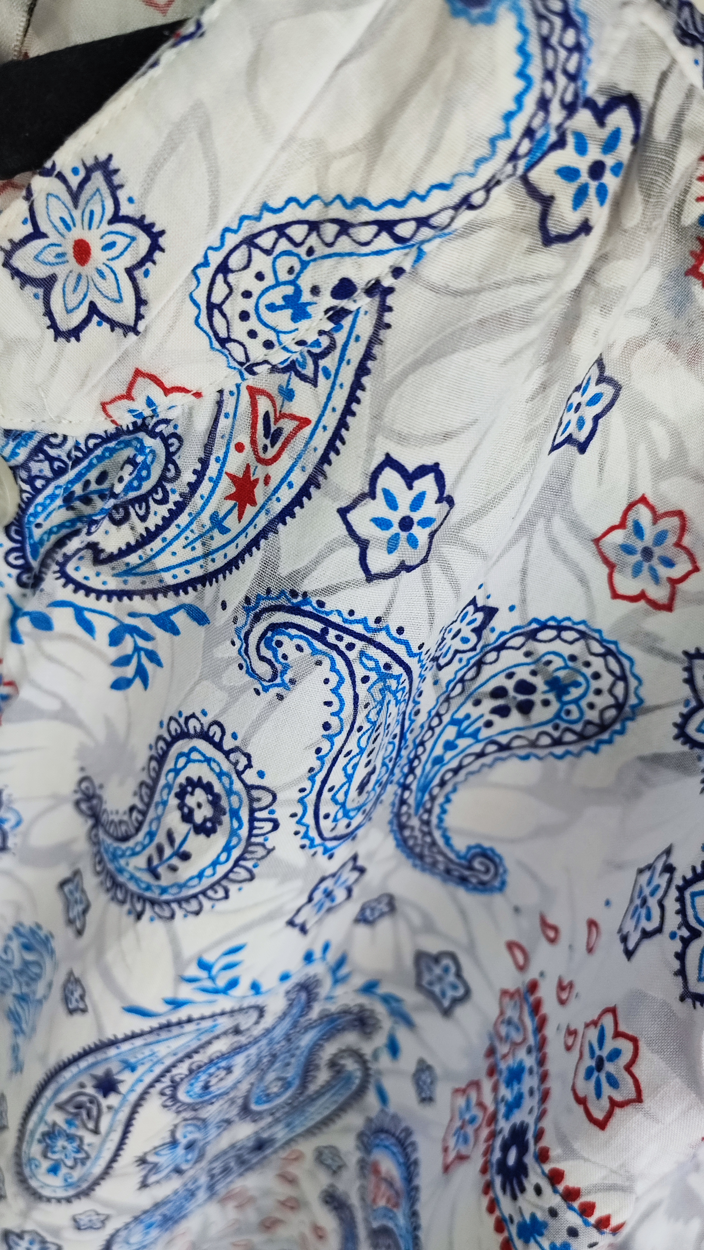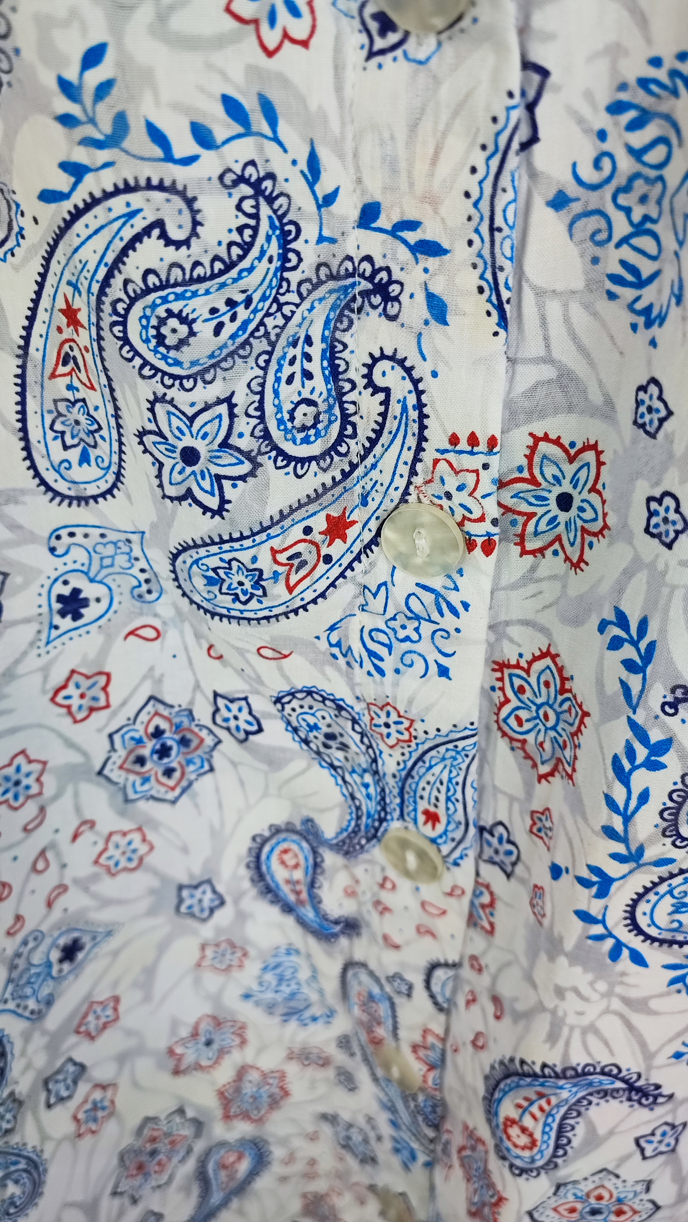 ترکیب پارچه این شومیز، ترکیبی هوشمندانه از پنبه و پلیاستر است. پنبه موجود در آن باعث لطافت، خنکی و تنفسپذیری عالی پارچه میشود (عالی برای فصول گرم یا زیر کت)، در حالی که پلیاستر از چروک شدن زیاد لباس جلوگیری کرده و اتوکشی را بسیار آسان میکند. طرح کلاسیک و اصیل بتهجقه (Paisley) با ترکیب رنگهای آبی، قرمز و پسزمینه سفید، استایلی نیمهرسمی و بسیار شیک به شما میدهد که هم برای دورهمیها و هم برای استفاده کژوال روزمره مناسب است.