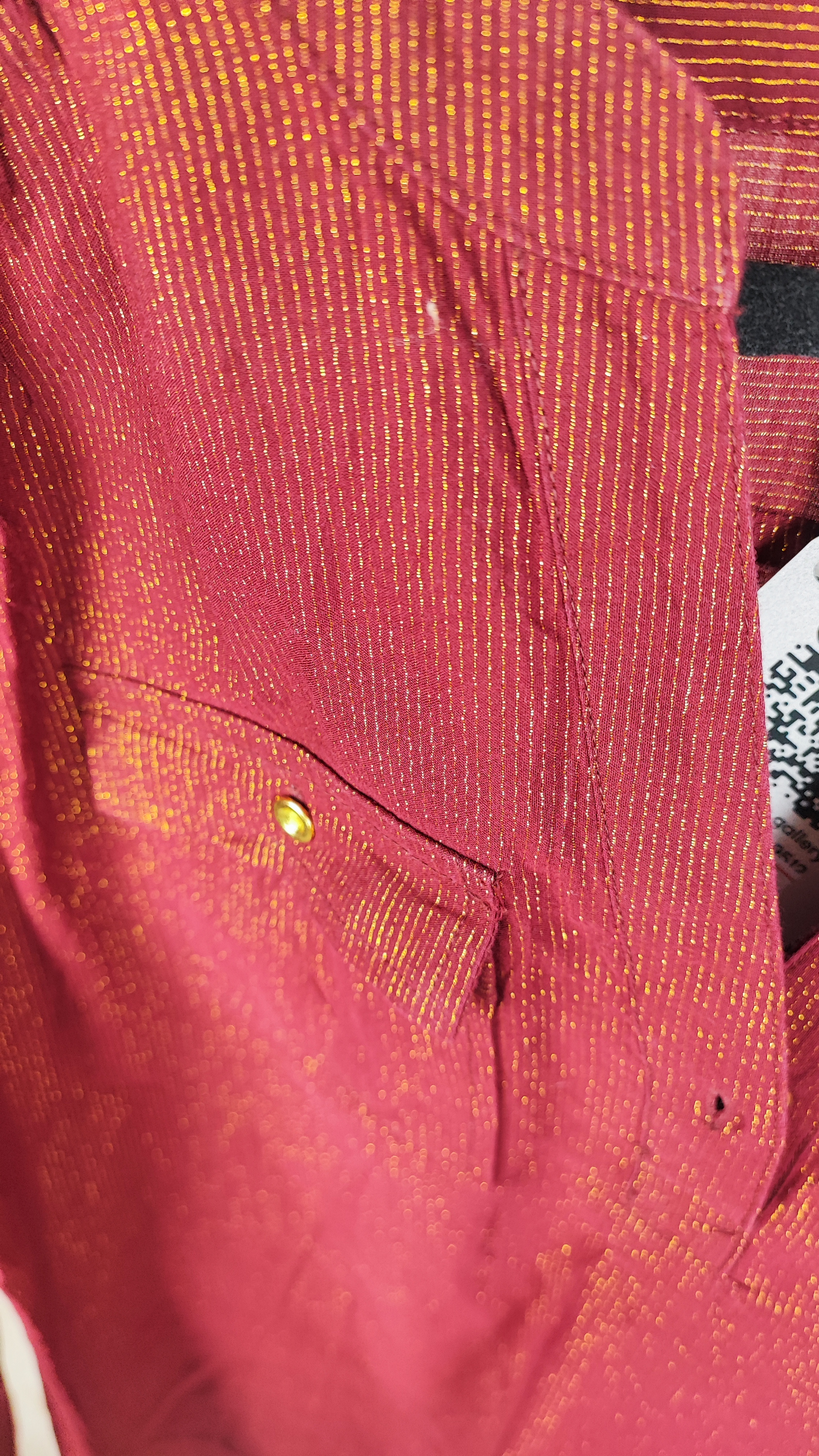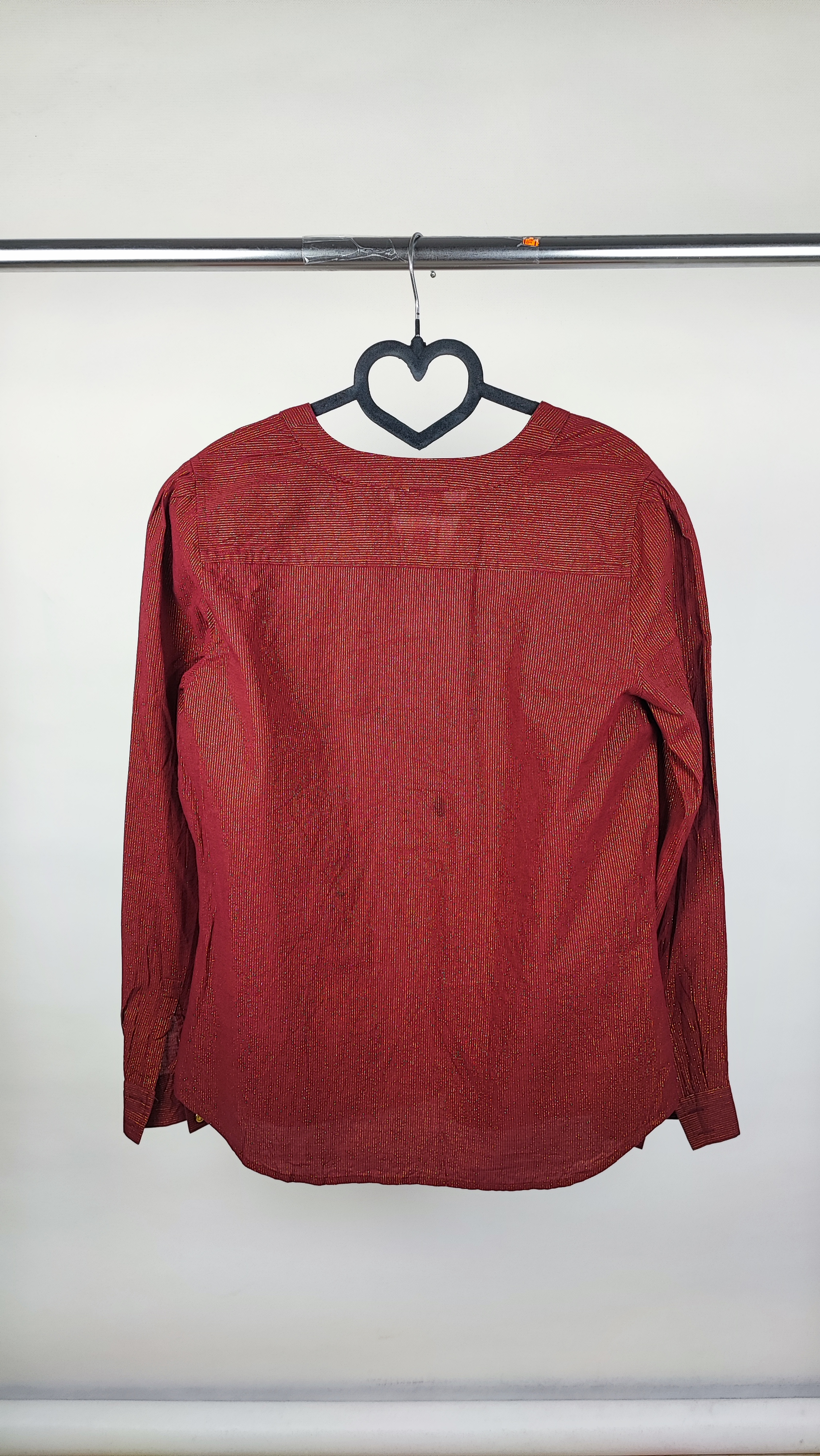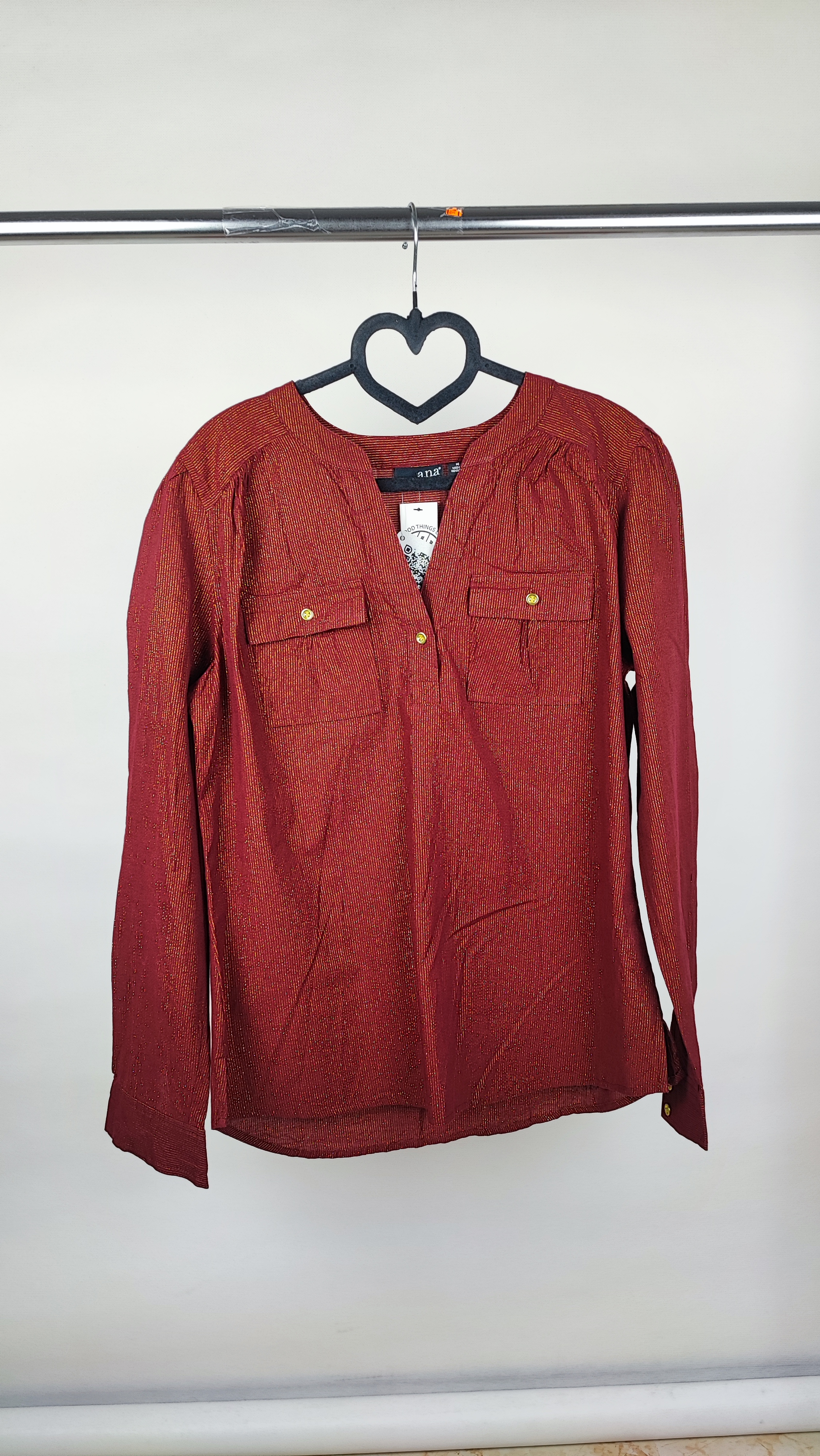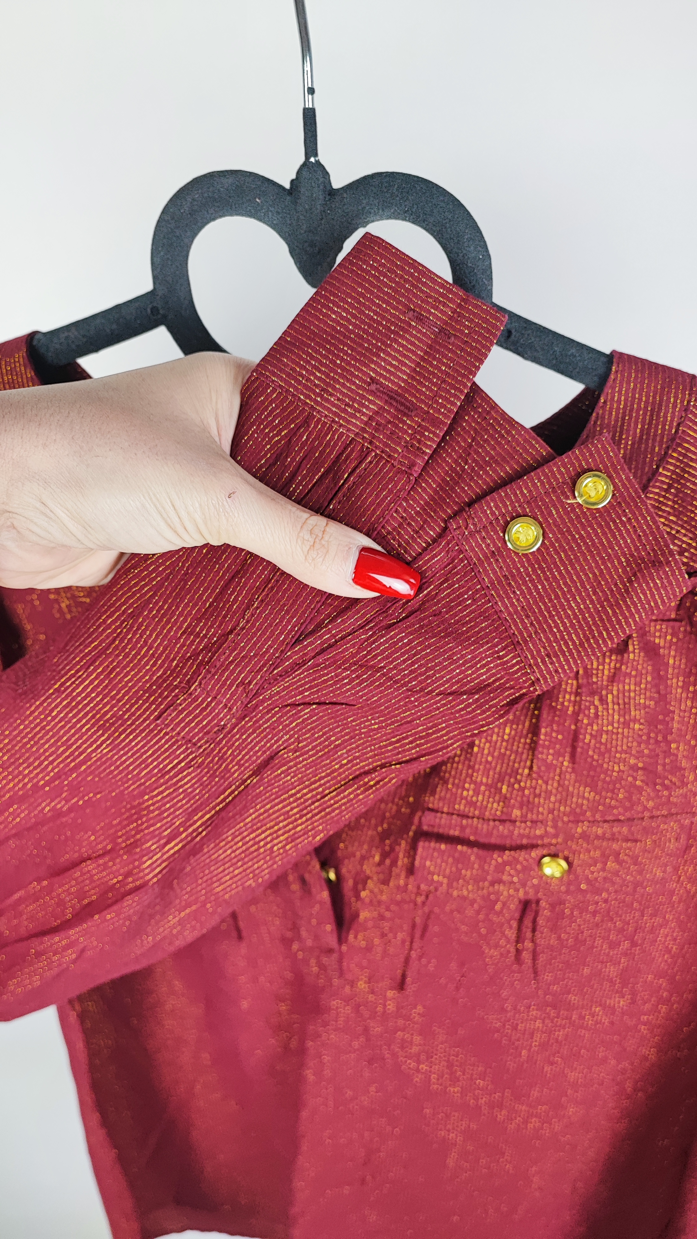 نقطه قوت این شومیز، متریال فوقالعاده آن است: ترکیبی از ۹۲٪ پنبه (Cotton) طبیعی برای لطافت و تنفسپذیری عالی، به همراه الیاف براق لورکس طلایی که به صورت خطوط عمودی ظریف در بافت جگریرنگ آن کار شدهاند. این ترکیب، استایلی شیک و در عین حال راحت به شما میدهد. دکمههای طلایی زیبا روی یقهی V شکل و جیبهای تزئینی جلو، جلوهای خاص به این کار بخشیدهاند. با خرید این محصول، صاحب یک برند معتبر با قیمتی بسیار کمتر از ارزش واقعی آن میشوید؛ یک انتخاب هوشمندانه برای خانمهای خوشسلیقه که به کیفیت اهمیت میدهند.