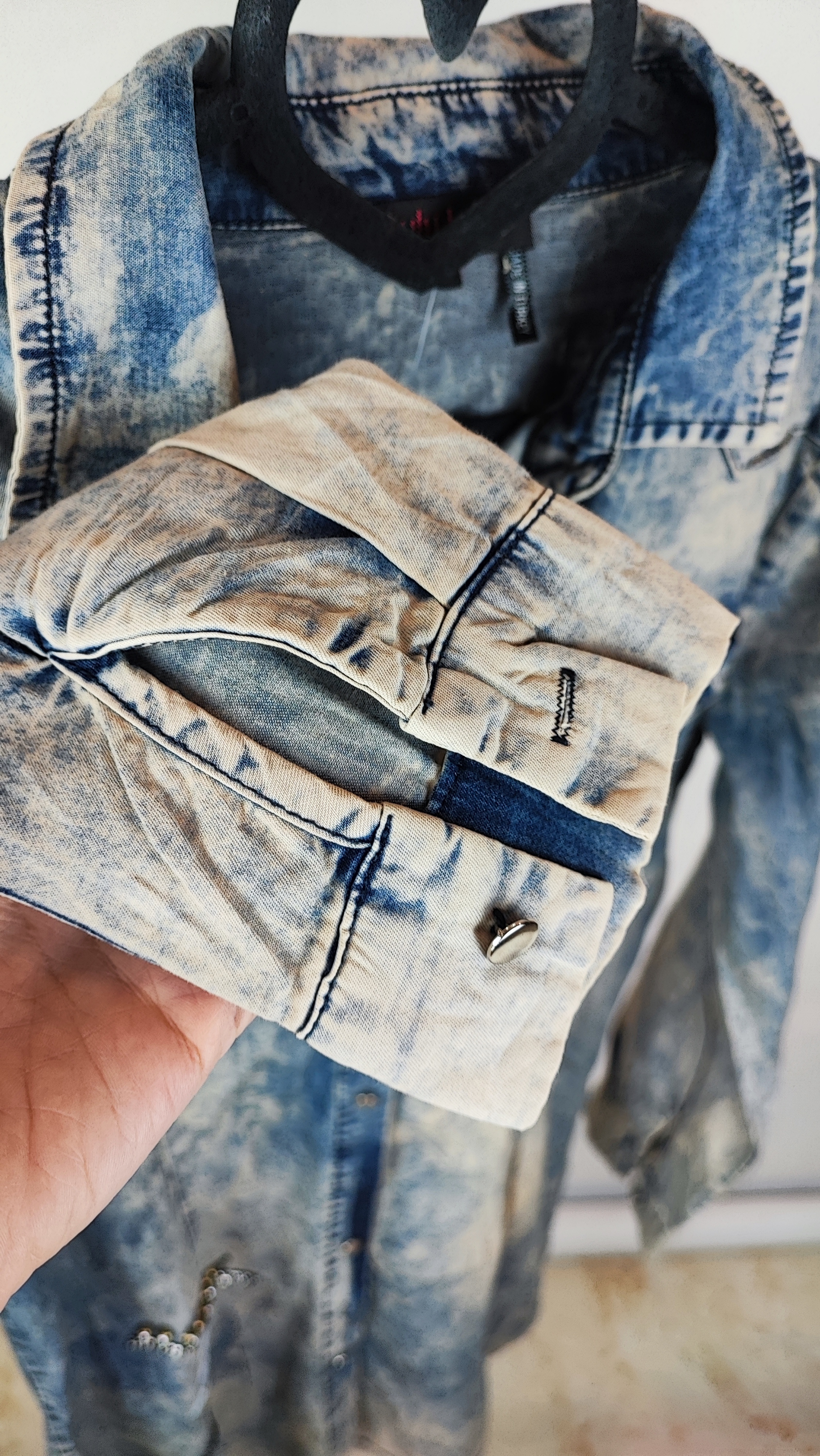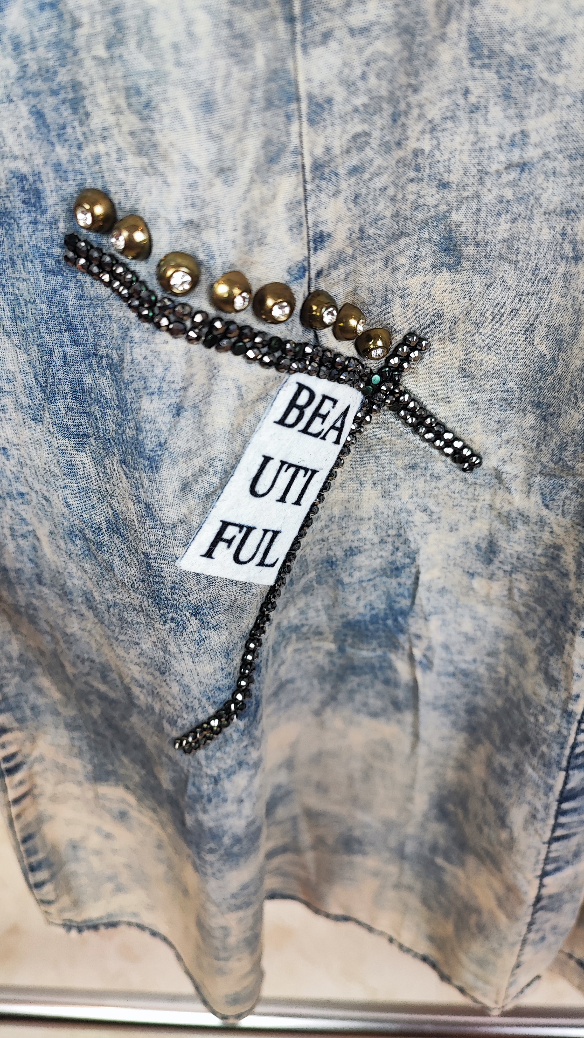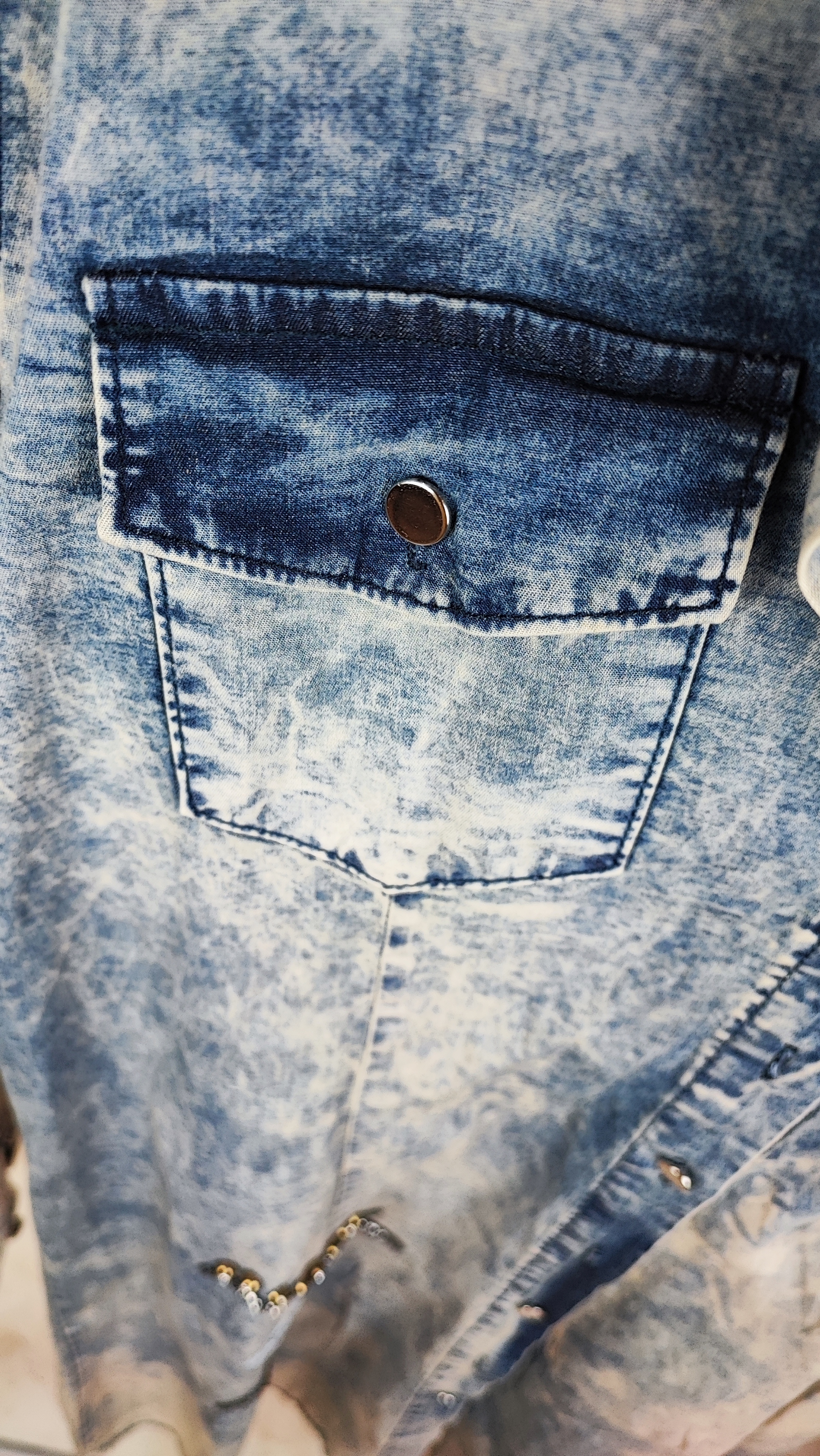 اگر به دنبال یک آیتم خاص و متفاوت برای تکمیل استایل کژوال خود هستید، این مانتو شومیزی با طرح اسیدشوی منحصربهفرد، دقیقاً همان چیزی است که نیاز دارید. این محصول ترکیبی جذاب از پارچه دینم (لی) سبک با شستشوی خاص آبی و کرم است که ظاهری جسورانه و مدرن به شما میبخشد. جزئیات جذابی مانند تکهدوزی نگیندار با متن "BEAUTIFUL" و گلدوزی ضربدری شکل با زنجیر ریز روی سینه، این کار را از نمونههای ساده بازار متمایز کرده است.