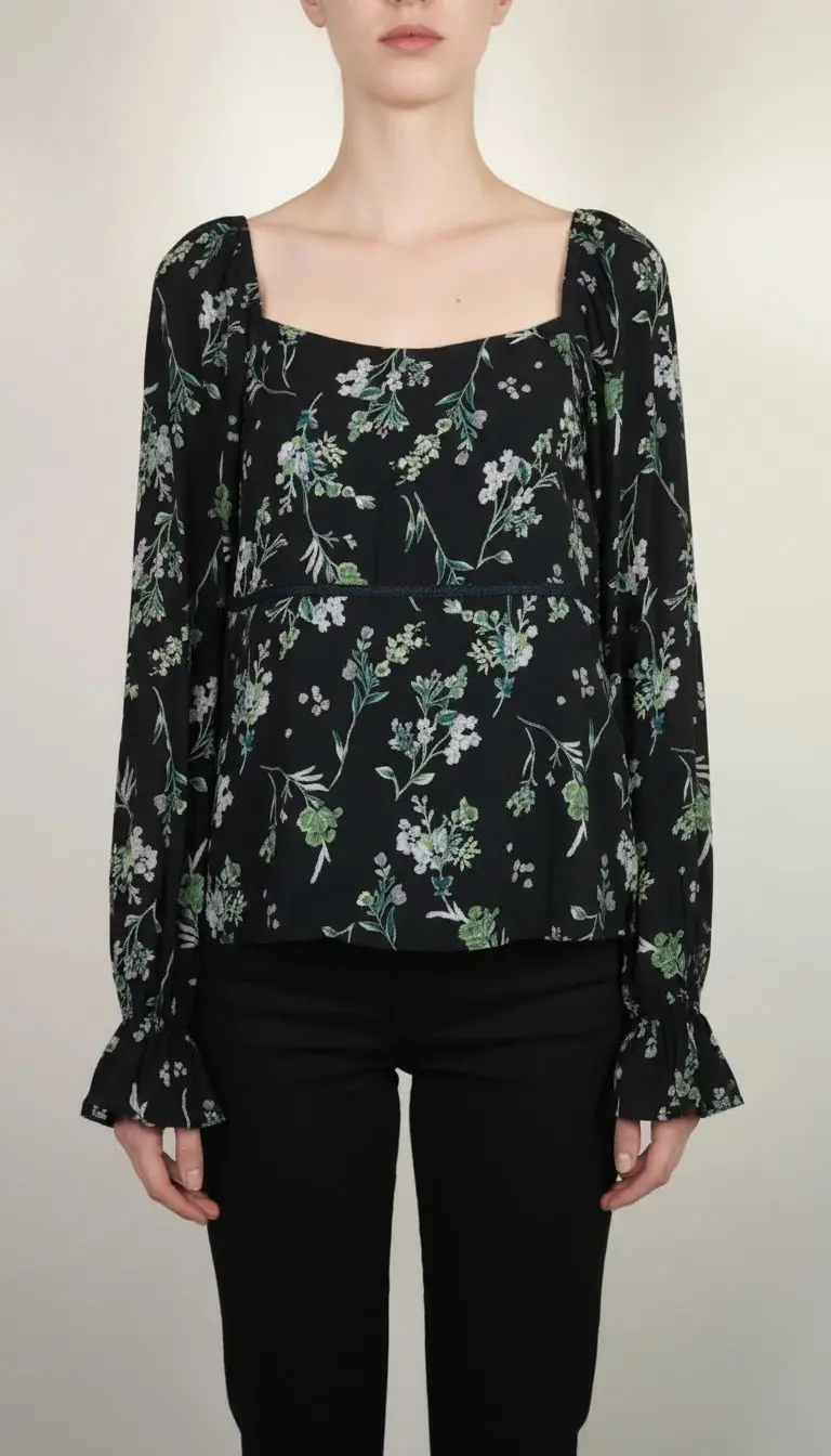 ناموجودشومیز زنانه گلدار مشکی استوک کد ۷۷۲ | مدل یقهچهارگوش آستینکش زرماه گالری