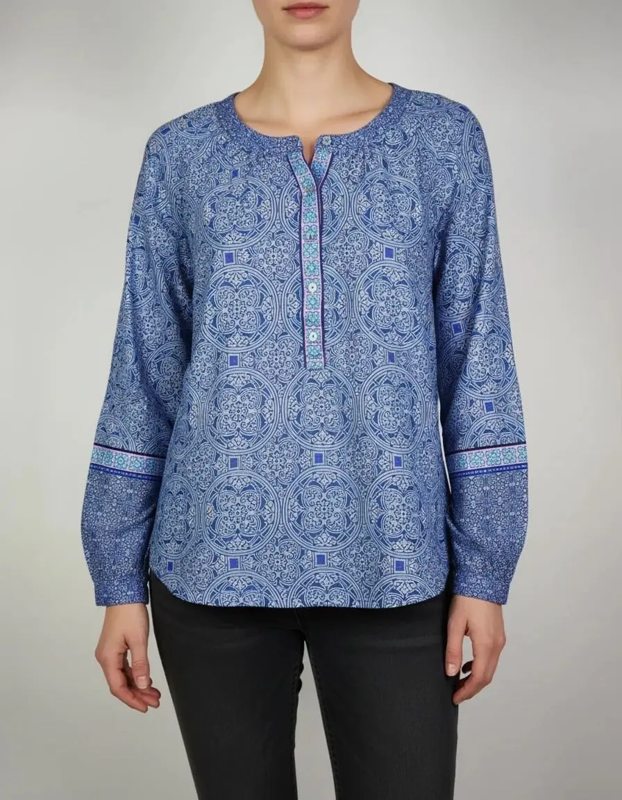 شومیز نیمتنه زنانه استوک کد ۱۴۱۵ | نیمتنه آبی طرحدار سبک و خنک مناسب سایز ۴۰–۴۲ | زرماه گالری