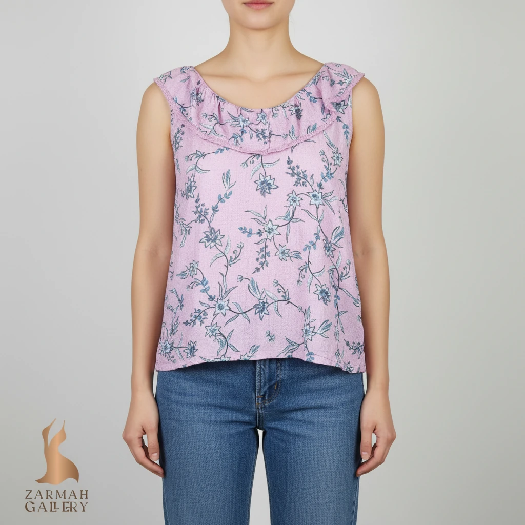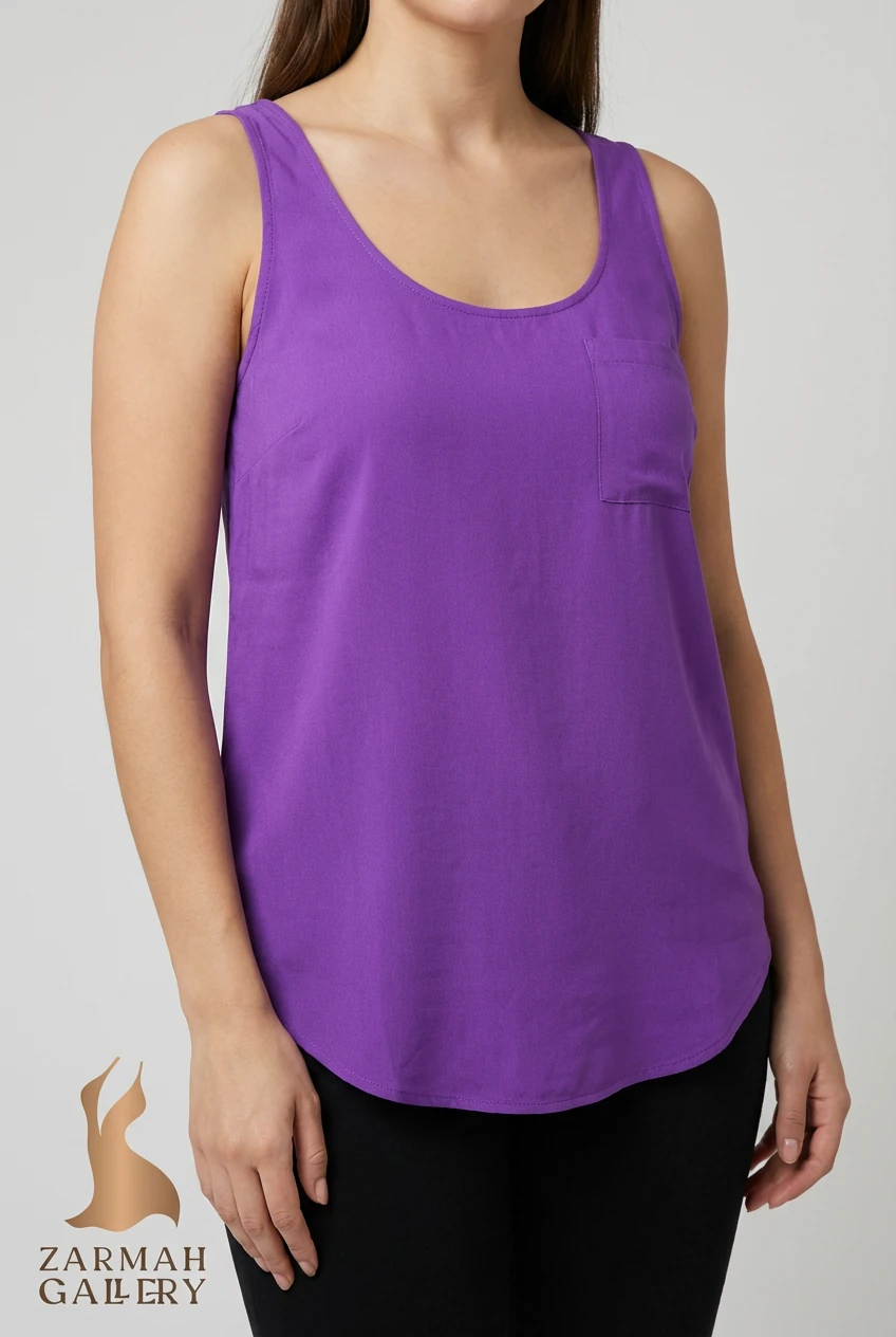 تاپ زنانه سایز بزرگ استوک کد ۱۳۴۴ | تونیک بدونآستین بنفش طرحدار آزاد و خنک سایز ۴۴–۴۶ | زرماه گالری
