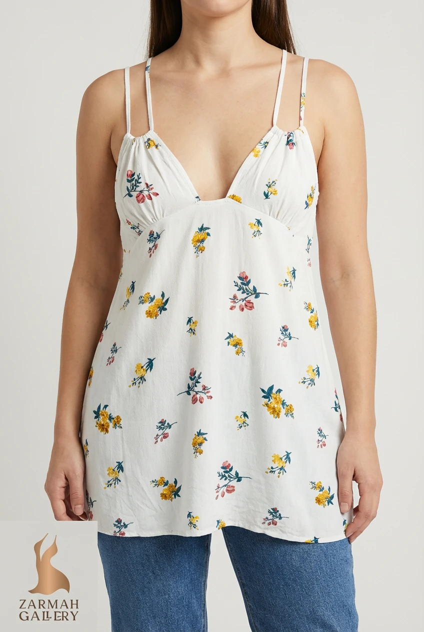 تاپ بندی زنانه سفید طرحدار استوک کد ۱۶۰۱ | مناسب سایز ۳۸–۴۰ | زرماه گالری