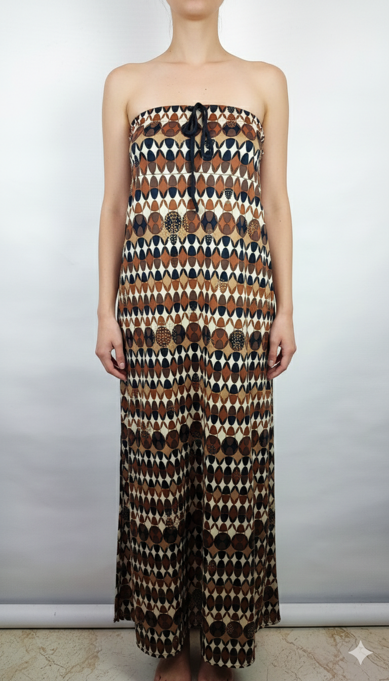پیراهن زنانه وارداتی استوک کد ۹۲۸ مناسب سایز ۳۸-۴۰ | مدل دکلته ساحلی بلند طرحدار قهوهای نسکافهای