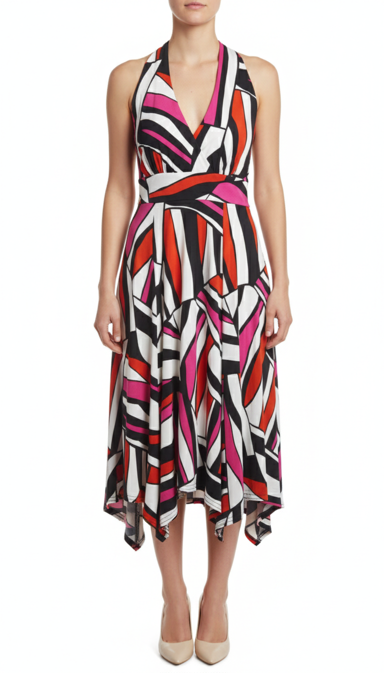 پیراهن زنانه وارداتی استوک کد ۱۰۳۷ مناسب سایز ۳۶-۳۸ | مدل یقه هفت بدون آستین طرح هندسی رنگی شاد