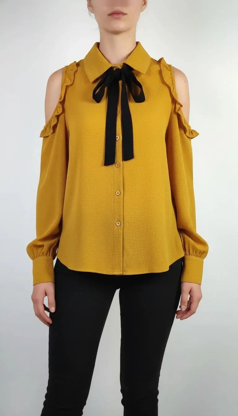 ناموجودشومیز زنانه استوک خردلی شانهباز با روبان مشکی کد ۷۵۴ | مدل شیک زرماه گالری