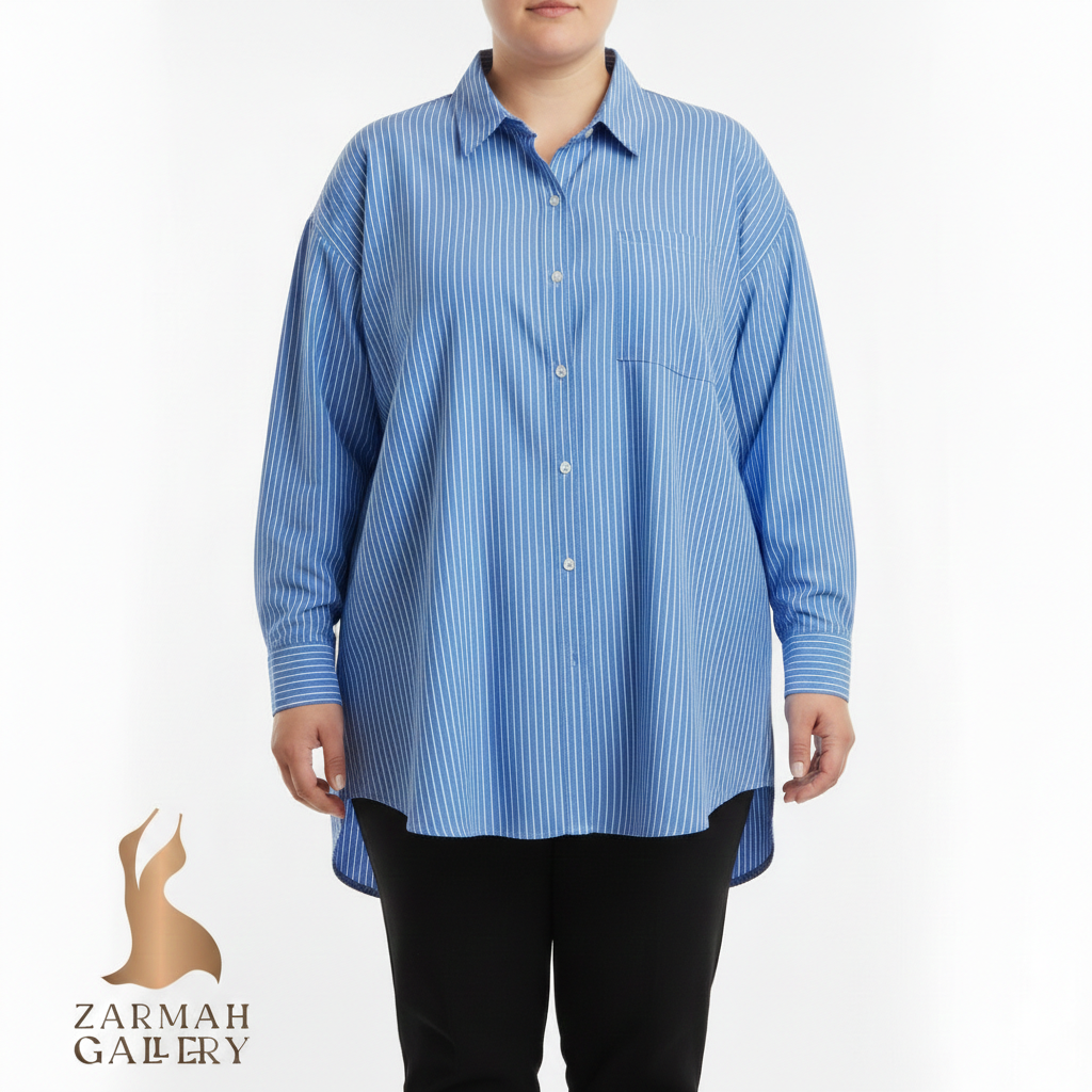 شومیز زنانه وارداتی استوک کد ۱۹۵۲مناسب سایز ۶۰-۶۲ | شومیز نخی راهراه آبی روشن مدل اورسایز شیک
