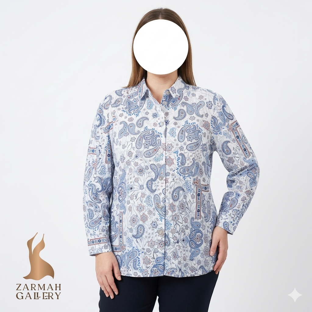 شومیز زنانه وارداتی استوک(ایراددار )کد ۱۹۷۰ مناسب سایز ۴۰-۴۲ | طرح گرافیکی سفید و آبی (ایراد جزئی دکمه)