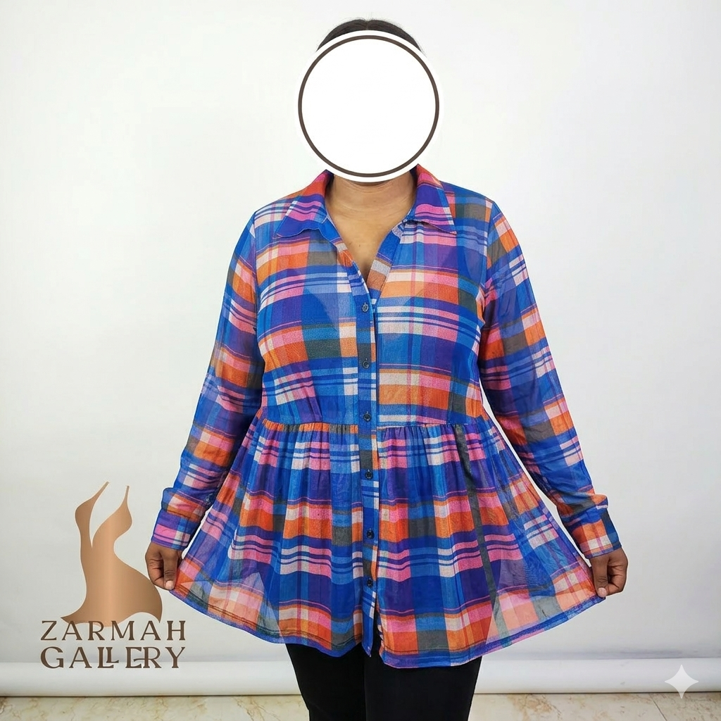 شومیز توری زنانه سایزبزرگ برند Terra & Sky استوک اروپایی کد ۲۰۸۶ مناسب سایز ۵۴.۵۶ | طراحی چهارخانه رنگارنگ و خنک با تنخور فوقالعاده
